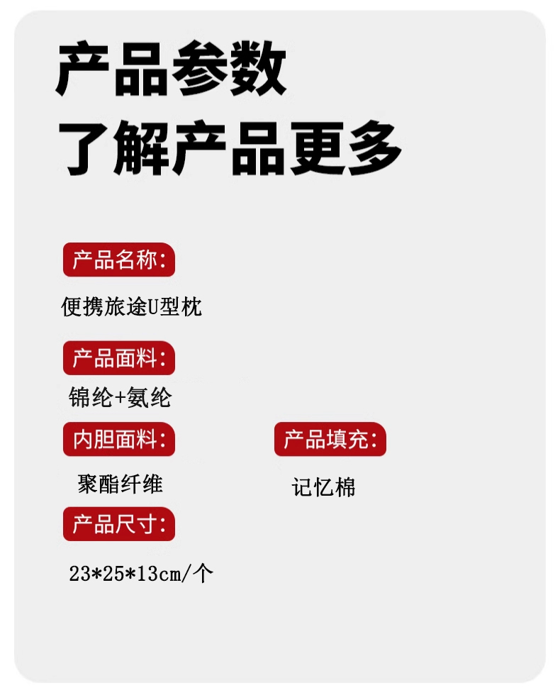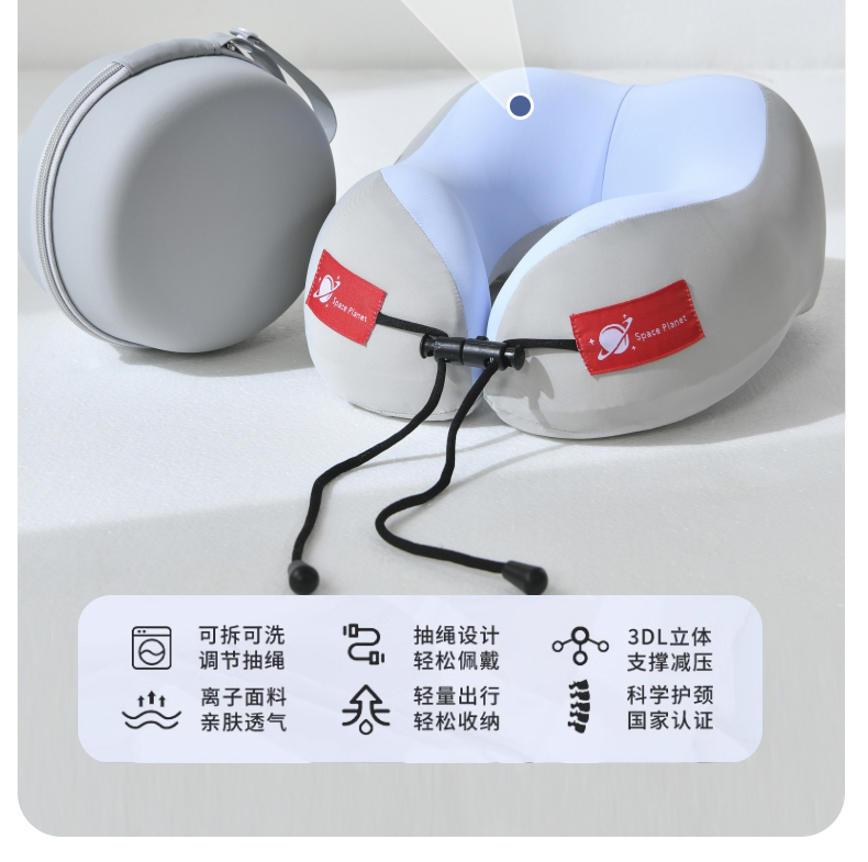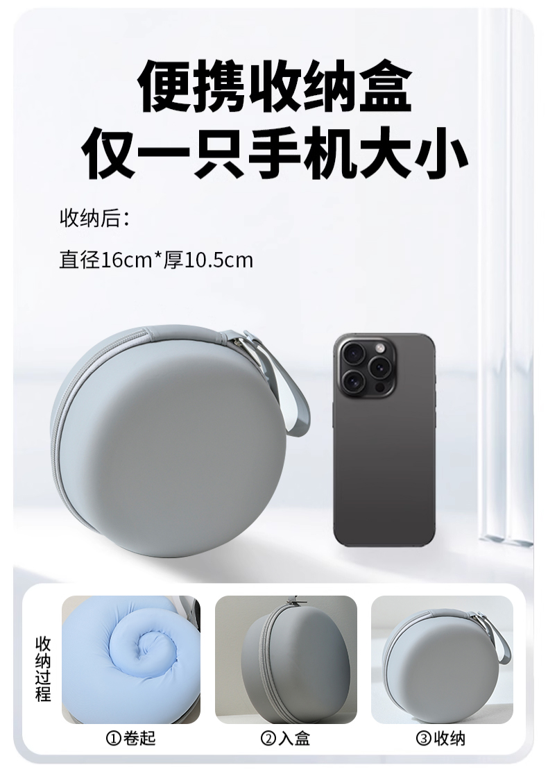 规格:23*25*13cm 面料:锦纶+氨纶 面料:记忆棉 1.能折叠才是真便携!小巧收纳,轻松便捷,高颜值为旅游加分! 2.简易出行,支撑脖颈。缓解疲劳,才能工作轻松。