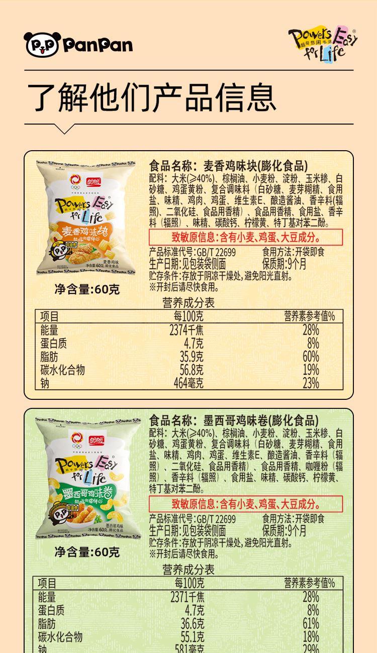 规格:60g 盼盼麦香鸡味块60g,一口酥脆,满满童年回忆!严选优质玉米粉搭配鲜香鸡肉提取物,非油炸工艺,每一口都金黄酥脆、麦香交融鸡肉鲜香,好吃不腻。6小袋独立包装,方便携带,解馋,聚会分享、宅家追剧都适配 。