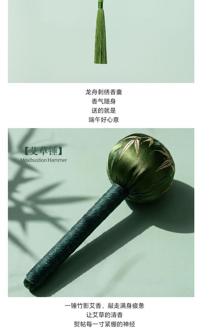 艾草锤:300*79mm,缎面刺绣 龙舟香囊:78x60mm,刺绣 折扇:266x30mm,绢布 折叠灯:124x124x32mm,电池款 粽子:157x128x93mm,真真老老140g*2 艾草锤配龙舟香囊,折扇折叠灯点亮双粽,端午安康好礼。 一锤一囊一扇一灯,双粽相伴,传统与巧思共庆佳节。 手作艾草锤捶走疲惫,龙舟香囊折扇折叠灯,双粽传情。