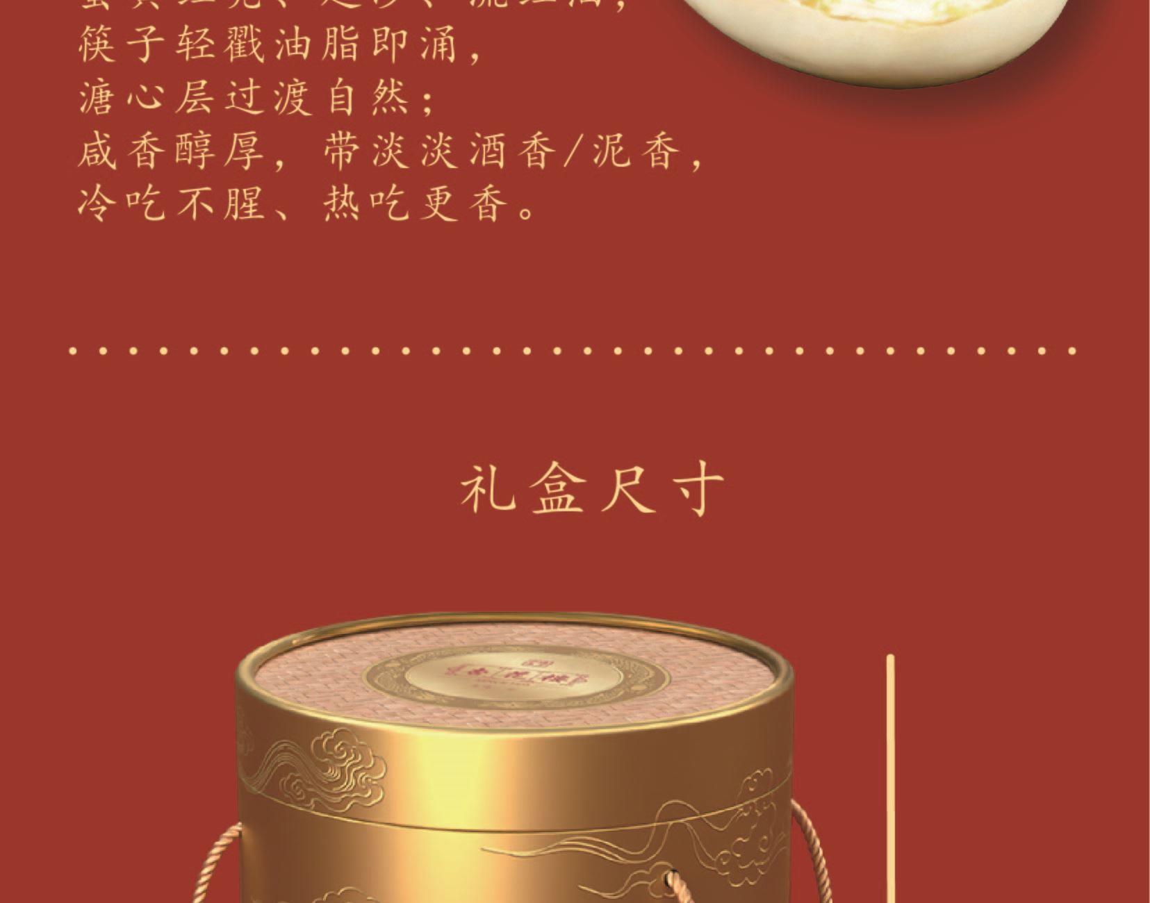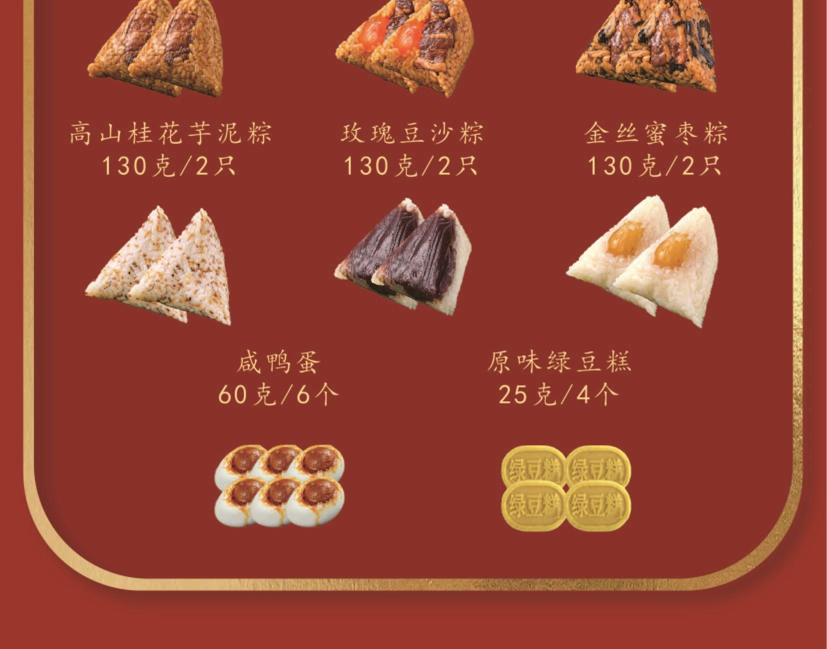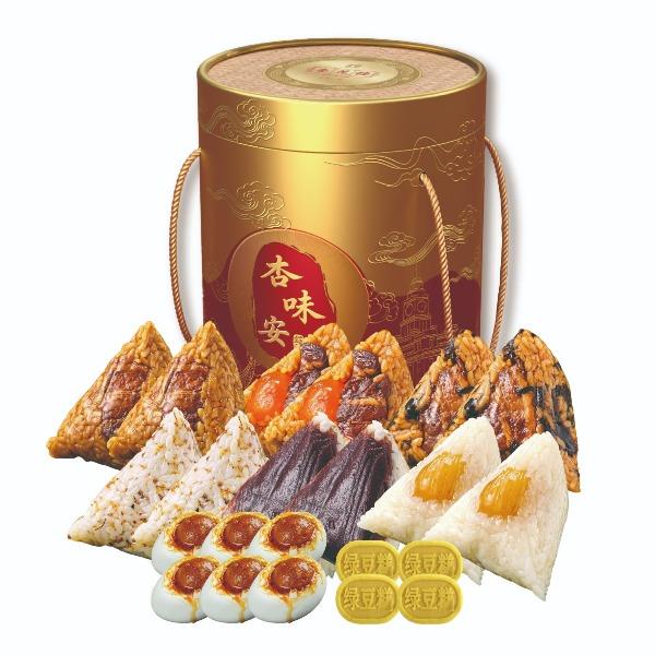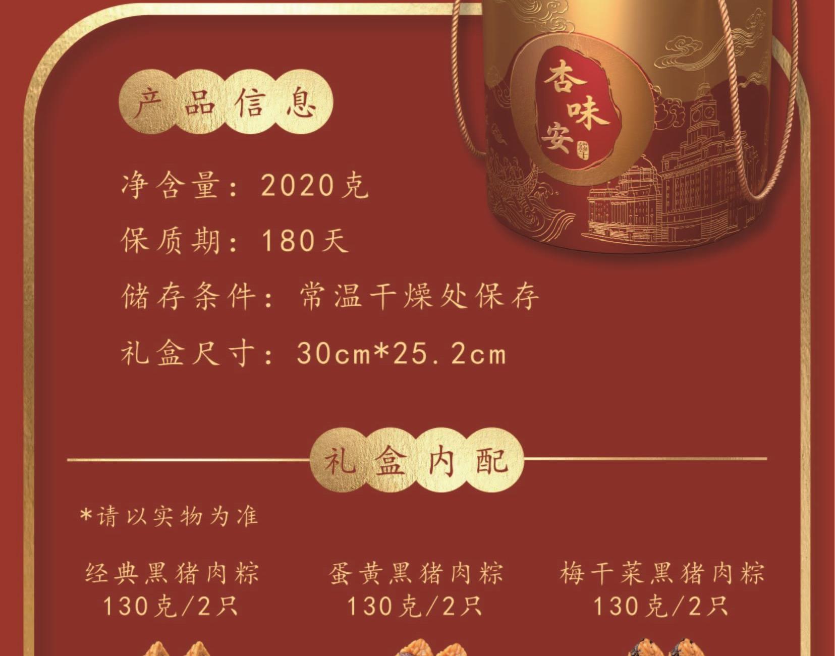 礼盒尺寸:22*22*26 内容物: 经典黑猪肉粽/130g*2 蛋黄黑猪肉粽/130g*2 梅干菜黑猪肉粽/130g*2 高山桂花芋泥粽/130g*2 玫瑰豆沙粽/130g*2 金丝蜜枣粽/130g*2 咸鸭蛋60g * 6 原味绿豆糕/25g*4 规格:2020g 保质期:3个月 百年杏花楼,一口老上海味道 四大金刚馅料之首,保密工艺 匠心百年,食在杏花楼