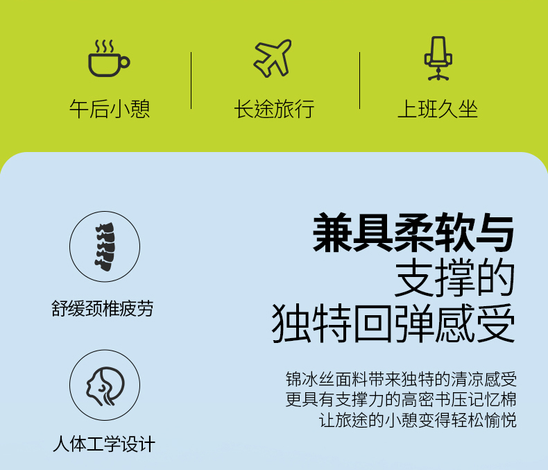 规格:29*25cm*1 面料:锦伦/氨纶 填充:高密舒压记忆棉 产品包装:精美礼盒 包装尺寸:30*29*13cm 特点:采用高密度记忆棉填充,具有很好的柔韧性和弹性,有效支撑颈椎。