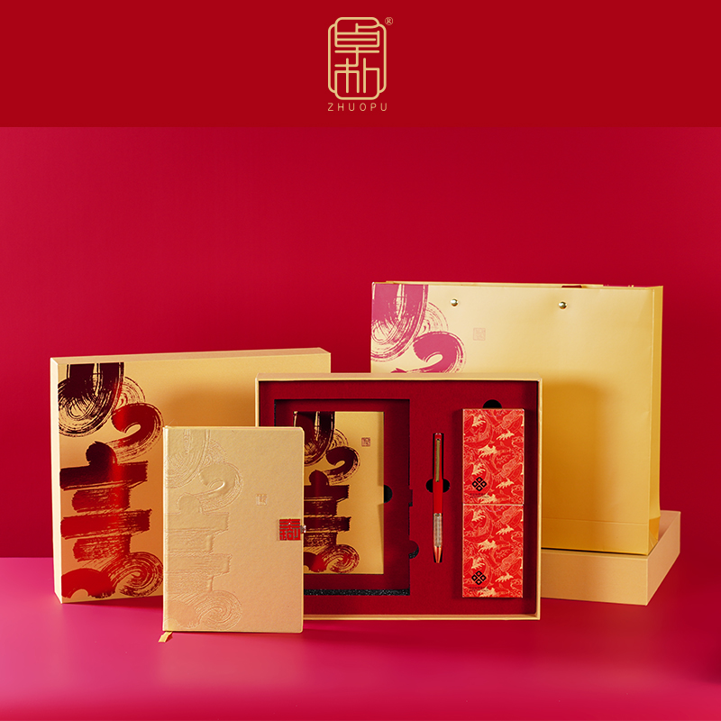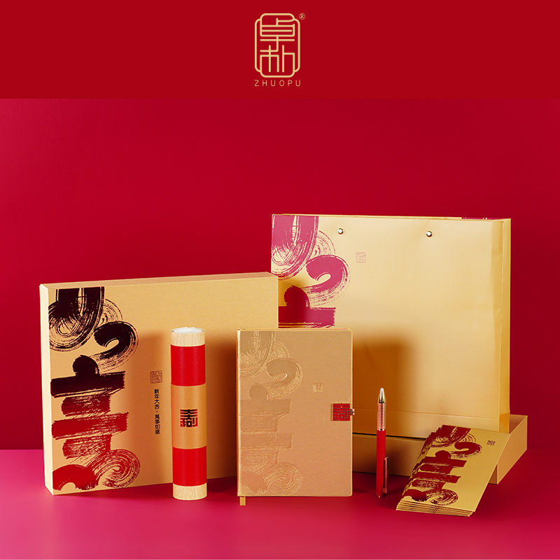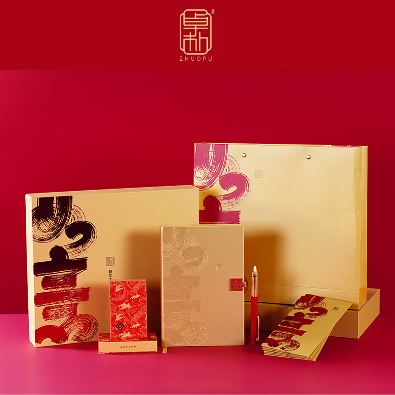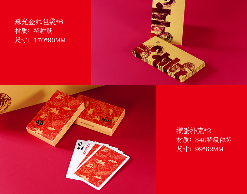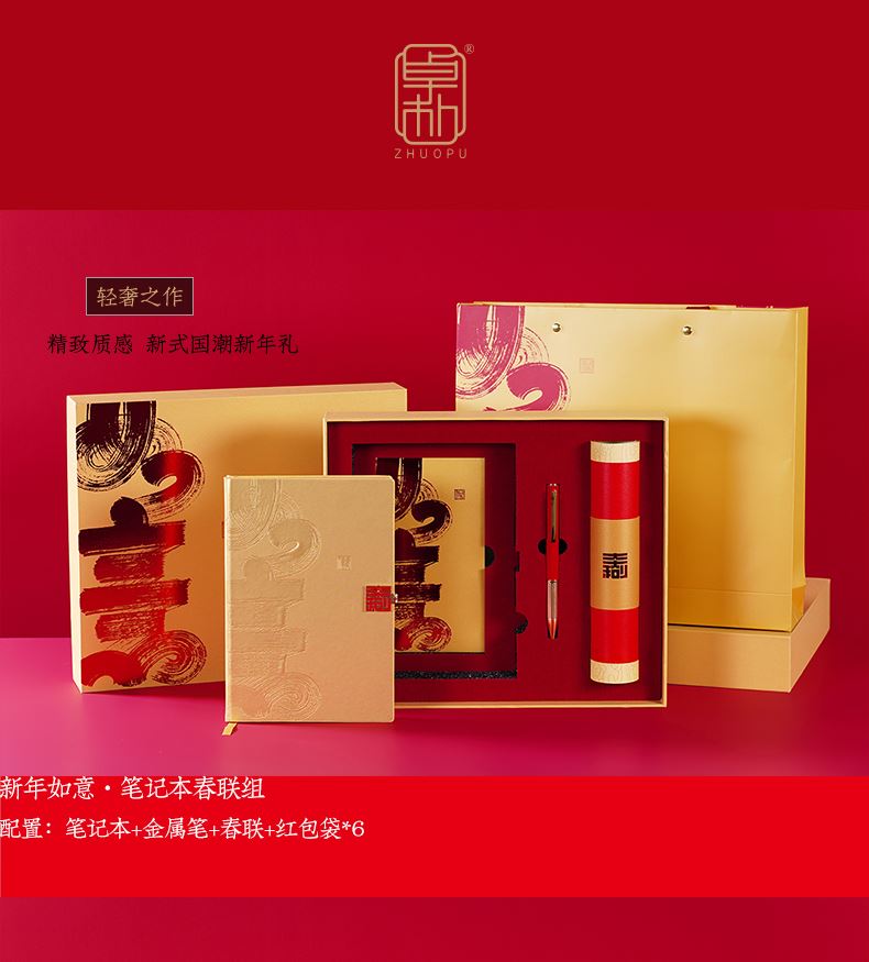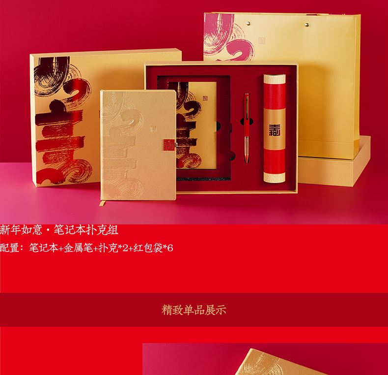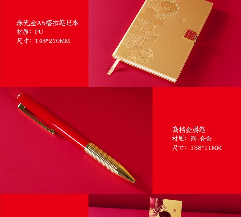 配置:笔记本+笔+春联+红包袋*6 材质:珠光金纸+白卡+合金+珠光皮 尺寸:笔记本145*210mm 签字笔138*11mm 春联1180*210mm 红包袋170*90mm 包装:珠光金礼盒(358*262*53mm)+手提袋