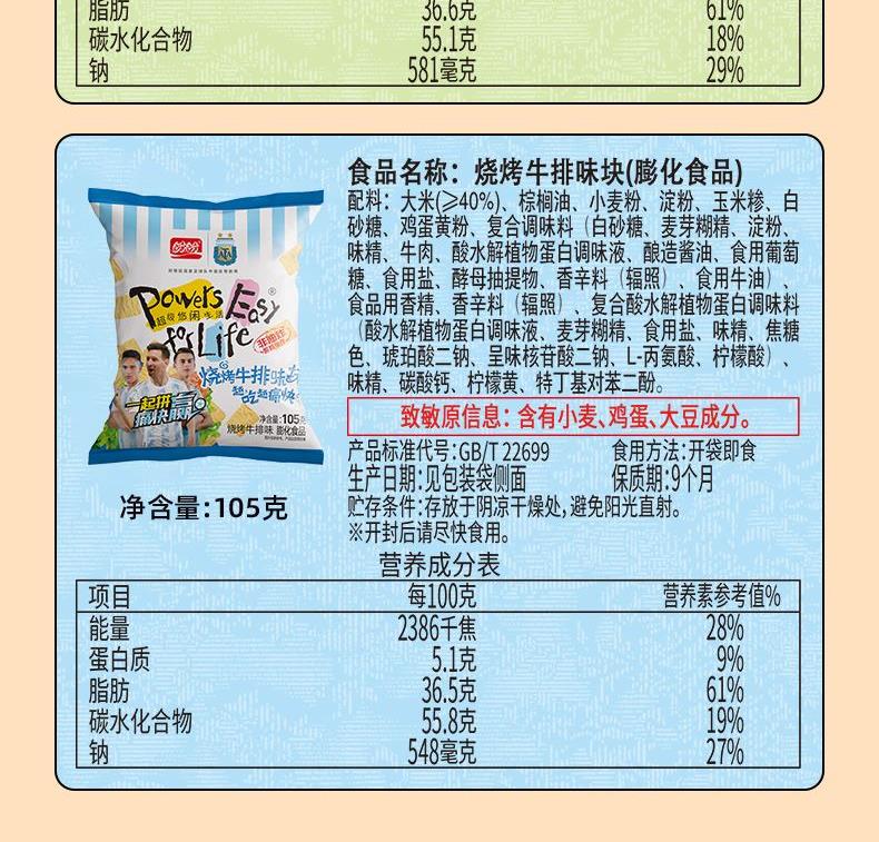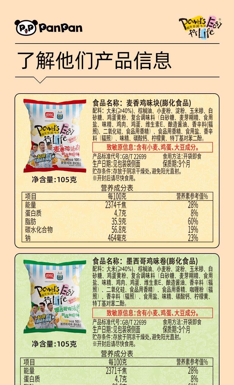 规格105g 盼盼麦香鸡味块105g,满满一包超满足!精选阳光小麦粉、优质玉米糁,非油炸工艺,健康不上火 。外表裹满特制粉料,入口金黄酥脆,融合,咸香可口不油腻。多种风味可选,追剧、聚会、解馋都合适。