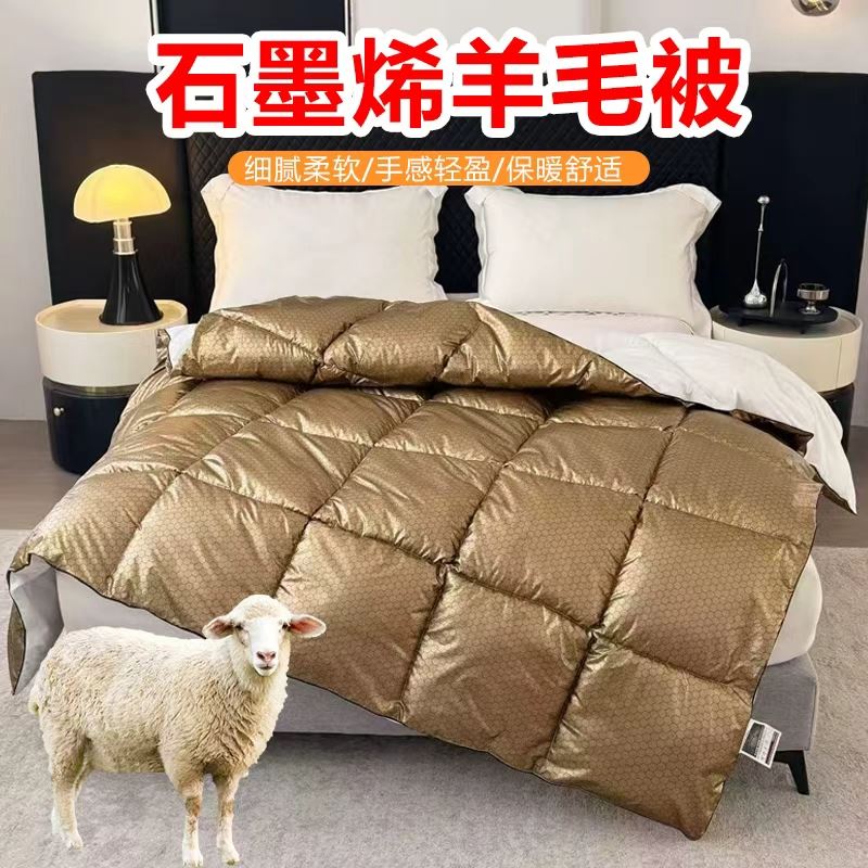 1:石墨烯羊毛被细腻柔软/手感轻盈/保暖舒适 尺寸:200*230cm*1 重量:约3kg 面料:石墨烯科技面料 包装:彩盒