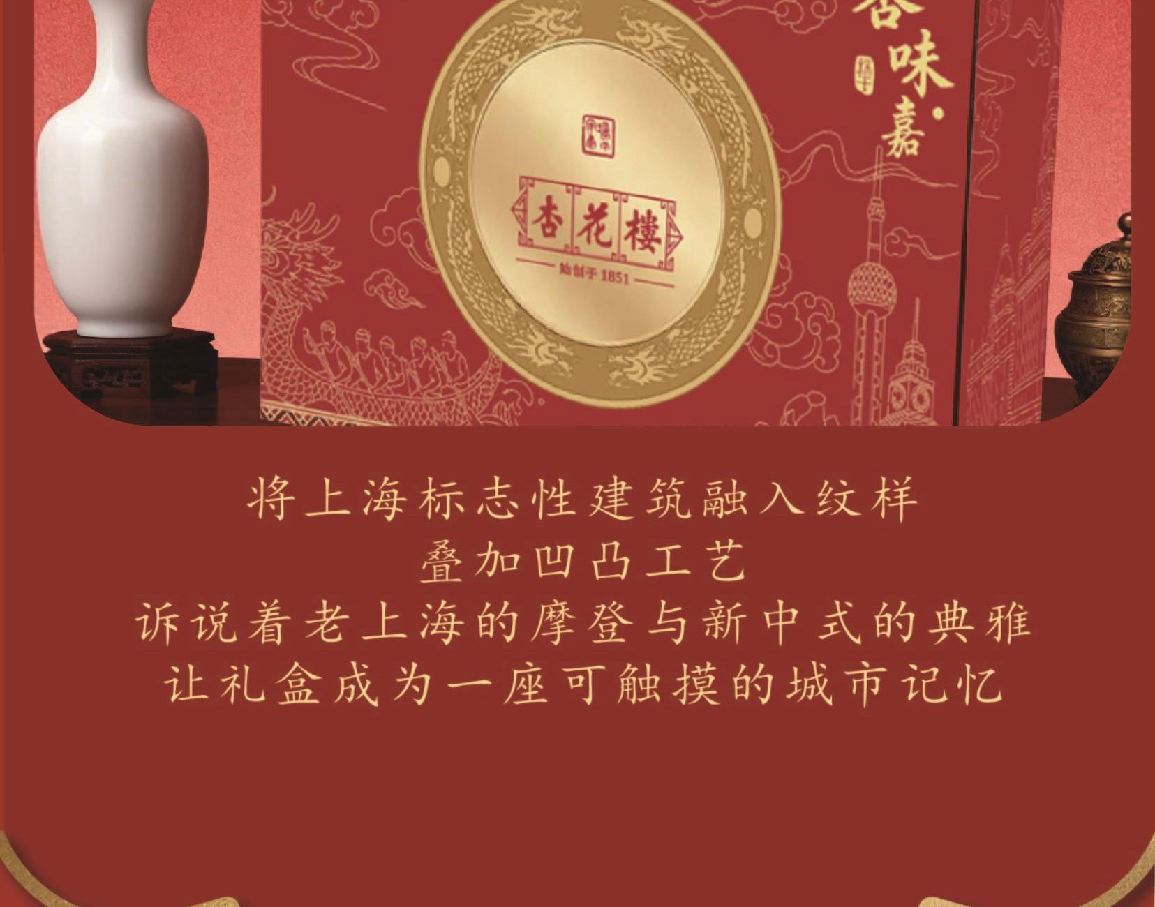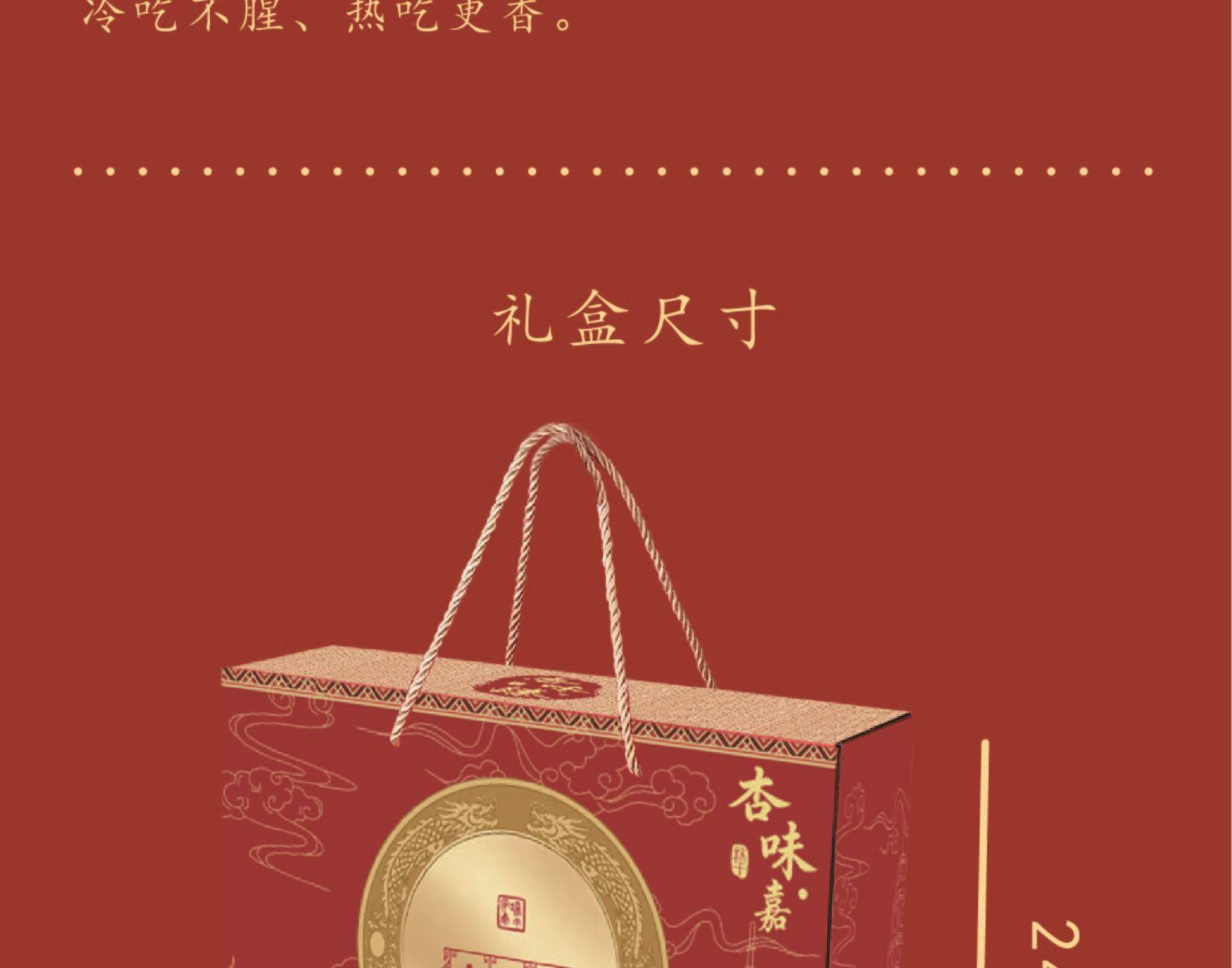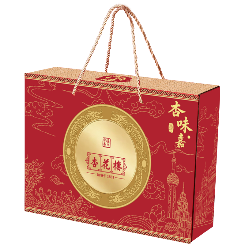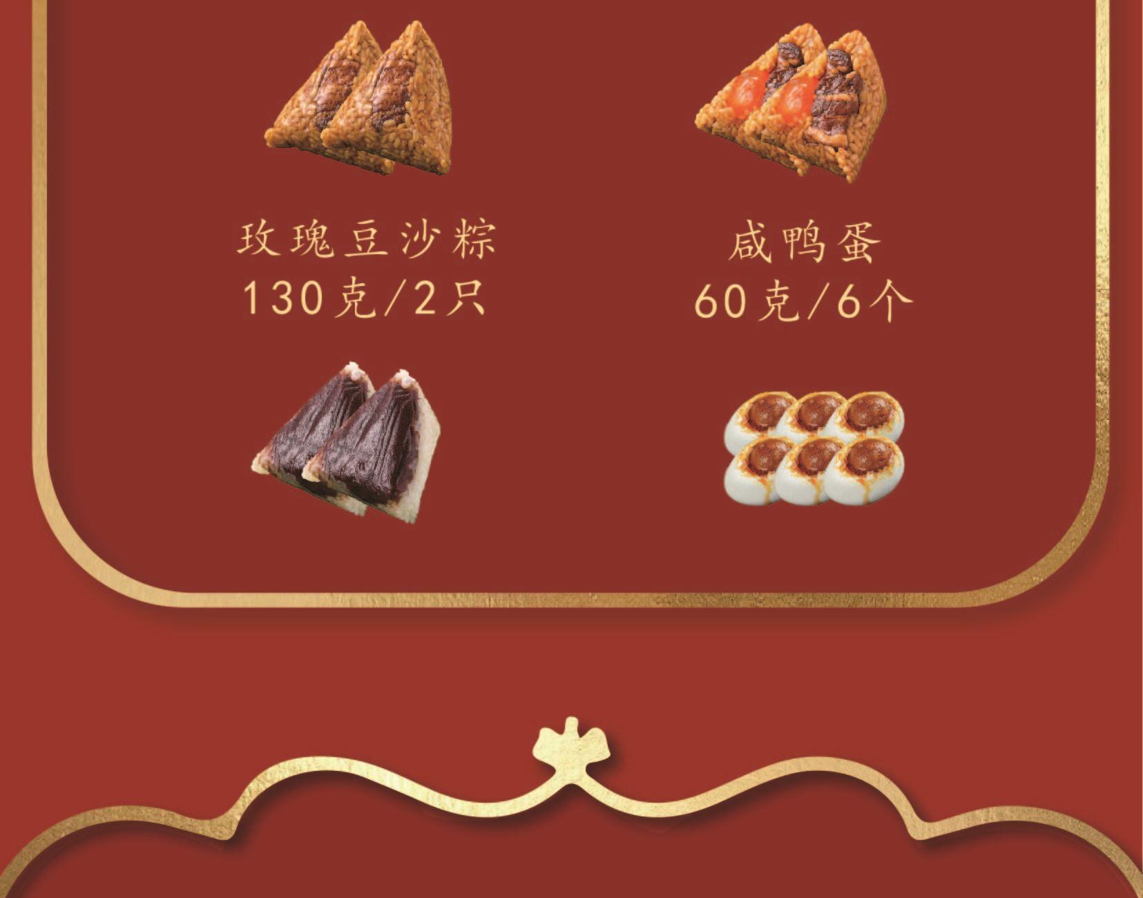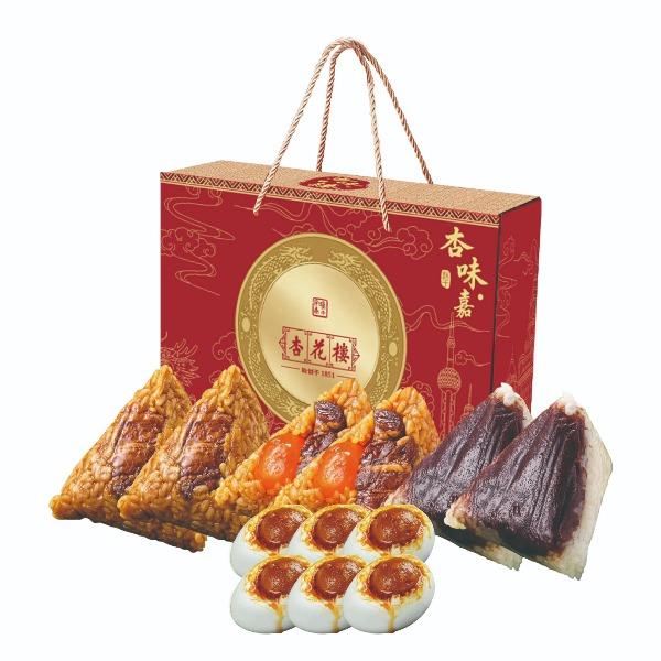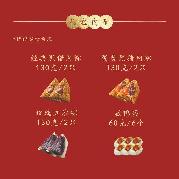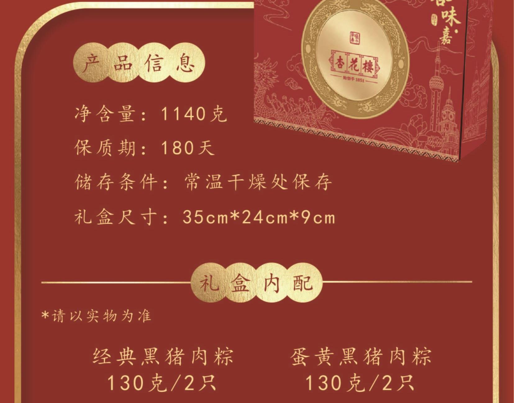 礼盒尺寸:35*24*9 内容物: 经典黑猪肉粽/130g*2 蛋黄黑猪肉粽/130g*2 玫瑰豆沙粽/130g*2 咸鸭蛋60g * 6 规格:1140g 保质期:6个月 百年杏花楼,一口老上海味道 四大金刚馅料之首,保密工艺 匠心百年,食在杏花楼