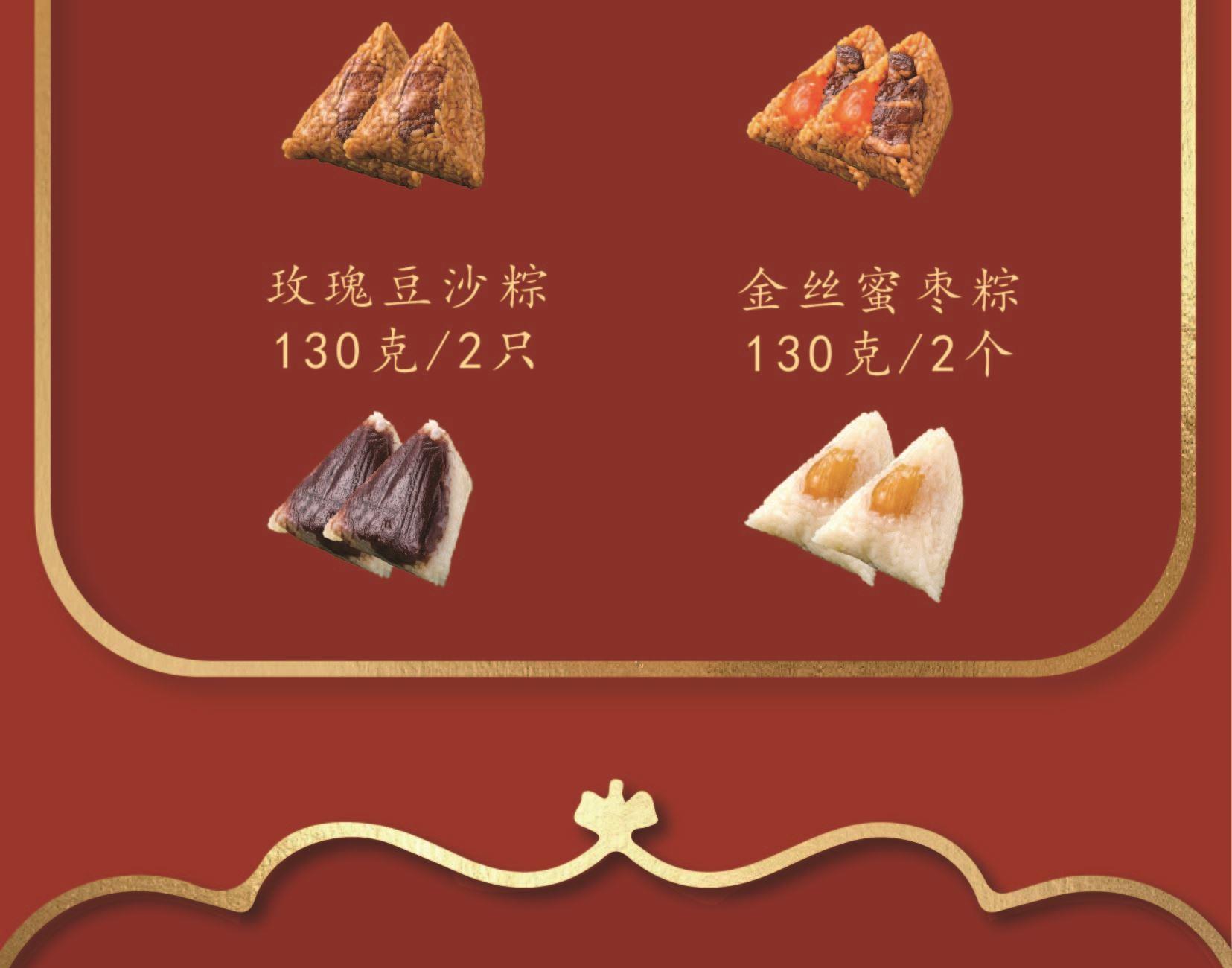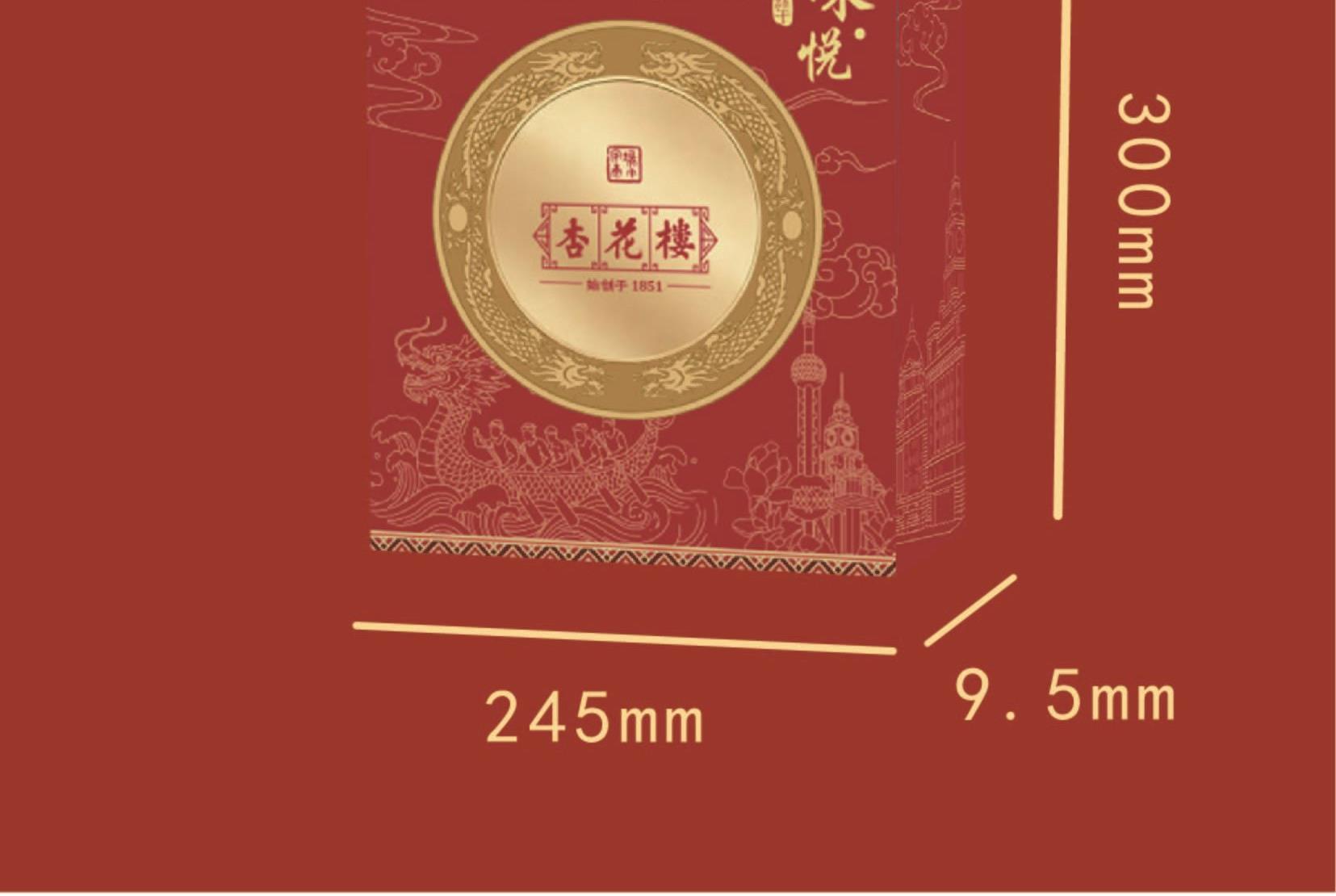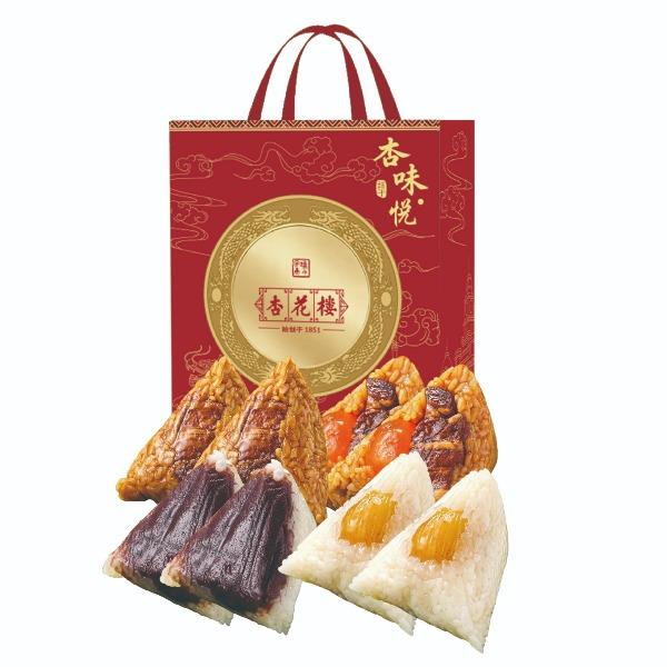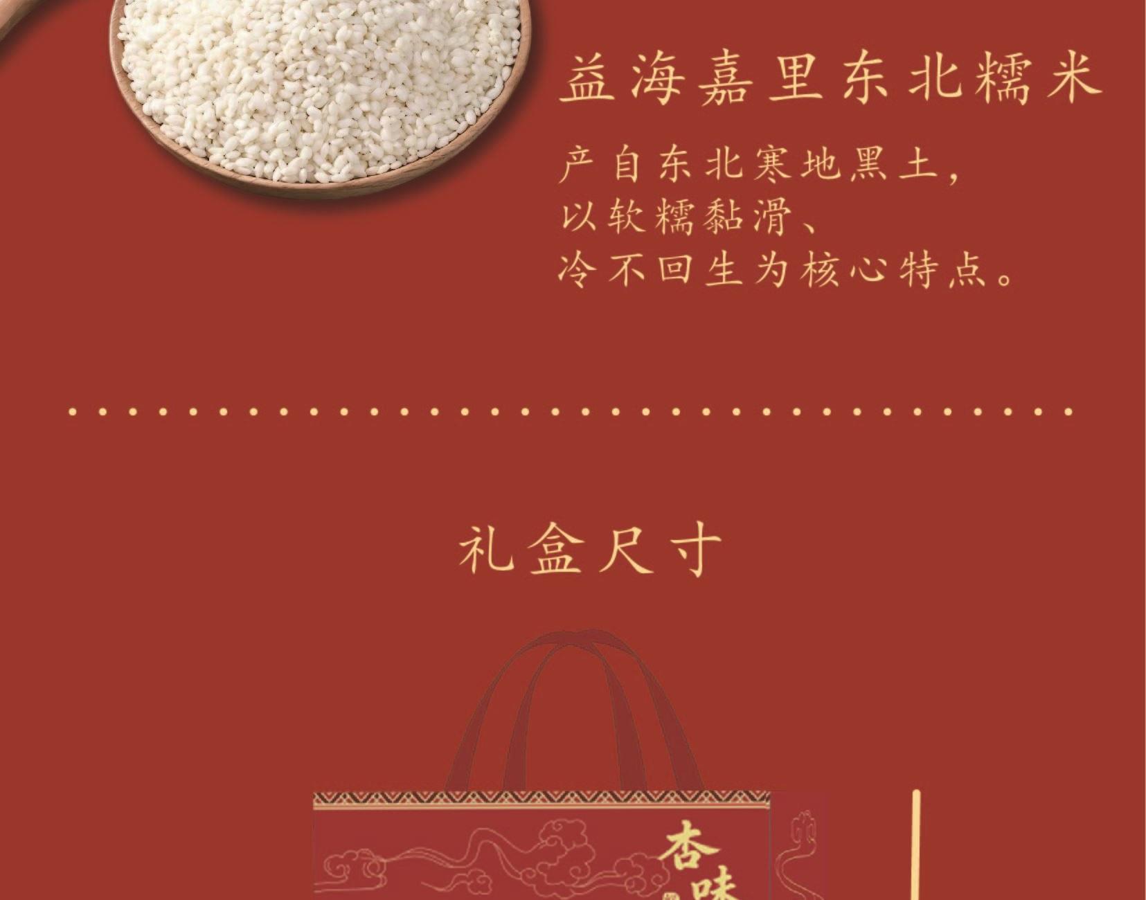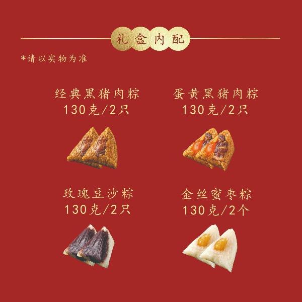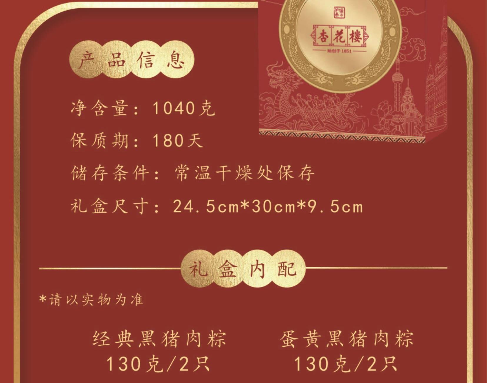 礼盒尺寸:24.5*30*9.5 内容物: 经典黑猪肉粽/130g*2 蛋黄黑猪肉粽/130g*2 玫瑰豆沙粽/130g*2 金丝蜜枣粽/130g*2 规格:1040g 保质期:9个月 百年杏花楼,一口老上海味道 四大金刚馅料之首,保密工艺 匠心百年,食在杏花楼