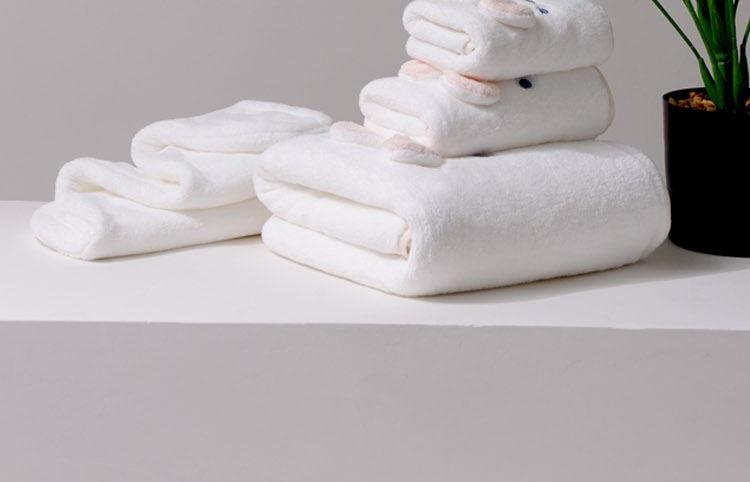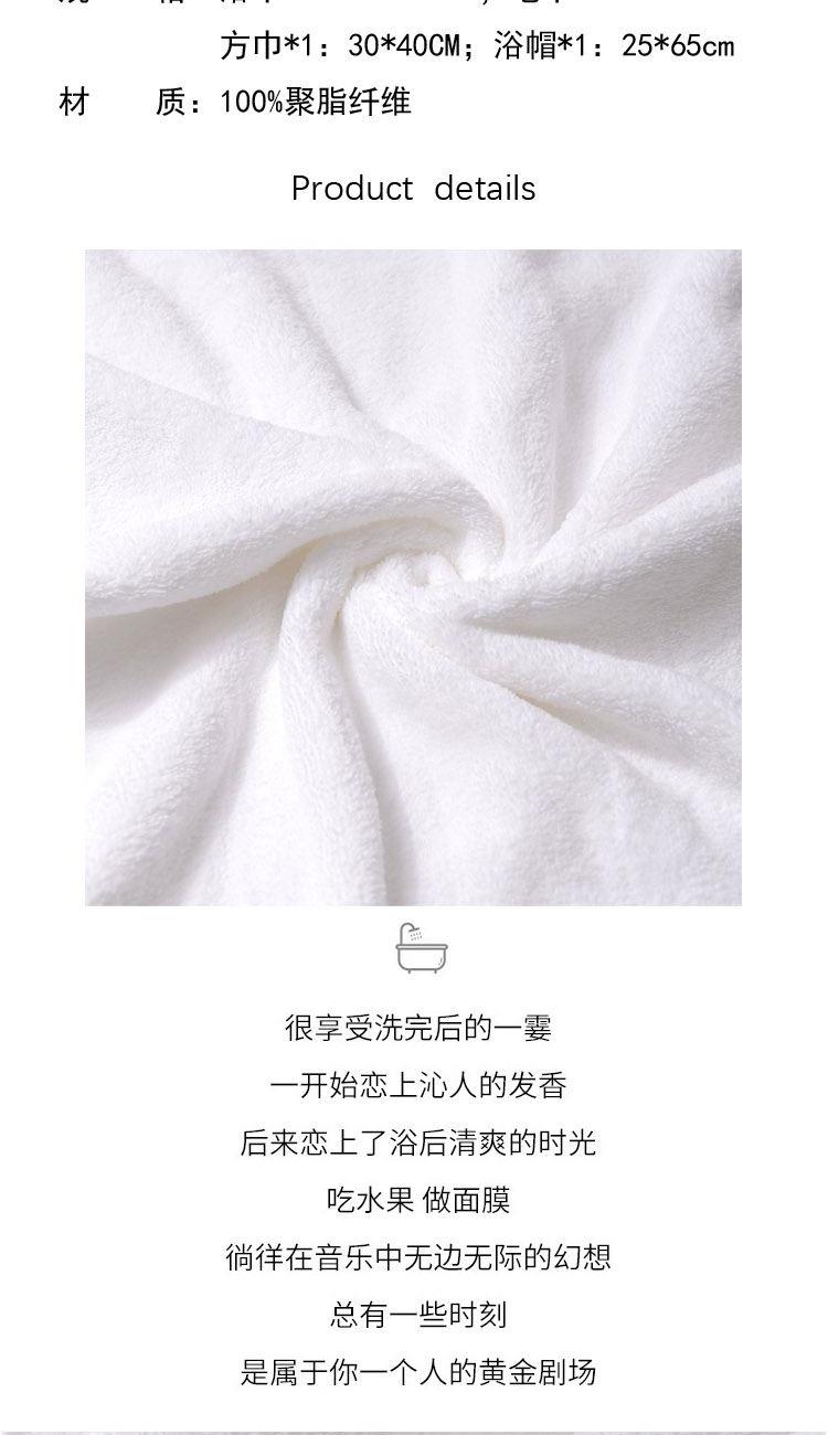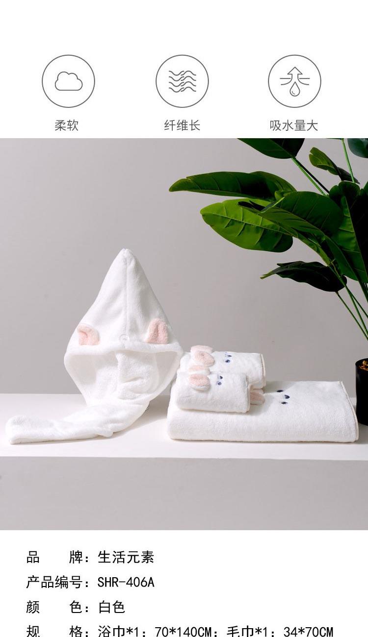 1、珊瑚绒采用超细纤维为原料制造生产,色彩斑斓、覆盖性好的呈珊瑚状的纺织面料。 2、质地细腻、手感柔软、不易掉毛、不起球、不掉色,对皮肤无任何刺激,不过敏。外形美观,颜色丰富 规格:浴 巾:1条/70*140cm 毛 巾:1条/34*70cm 小方巾:1条/30*40cm 浴 帽:1个/25*65cm 面料:聚酯纤维 颜色:白色 包装方式:礼盒+手提袋 包装尺寸: 370*290*60mm