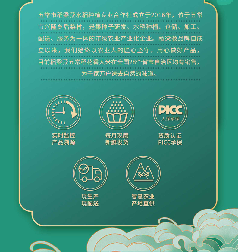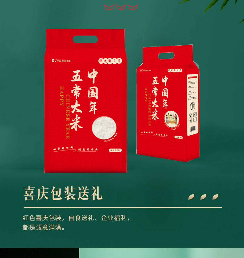 包装:真空袋装 执行标准:GB/T 19266 保质期:6个月 质量等级:优质一级 产地:黑龙江五常市 产品尺寸:300mm*240mm*80mm 推荐理由: 1、五常稻花香2号米。 2、PICC人保承保产品。 3、稻田24小时实时监控。 4、智慧农业系统。 5、当月现磨新米发货。 6、独立溯源码。 7、双层真空保鲜。