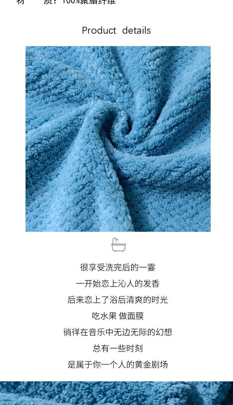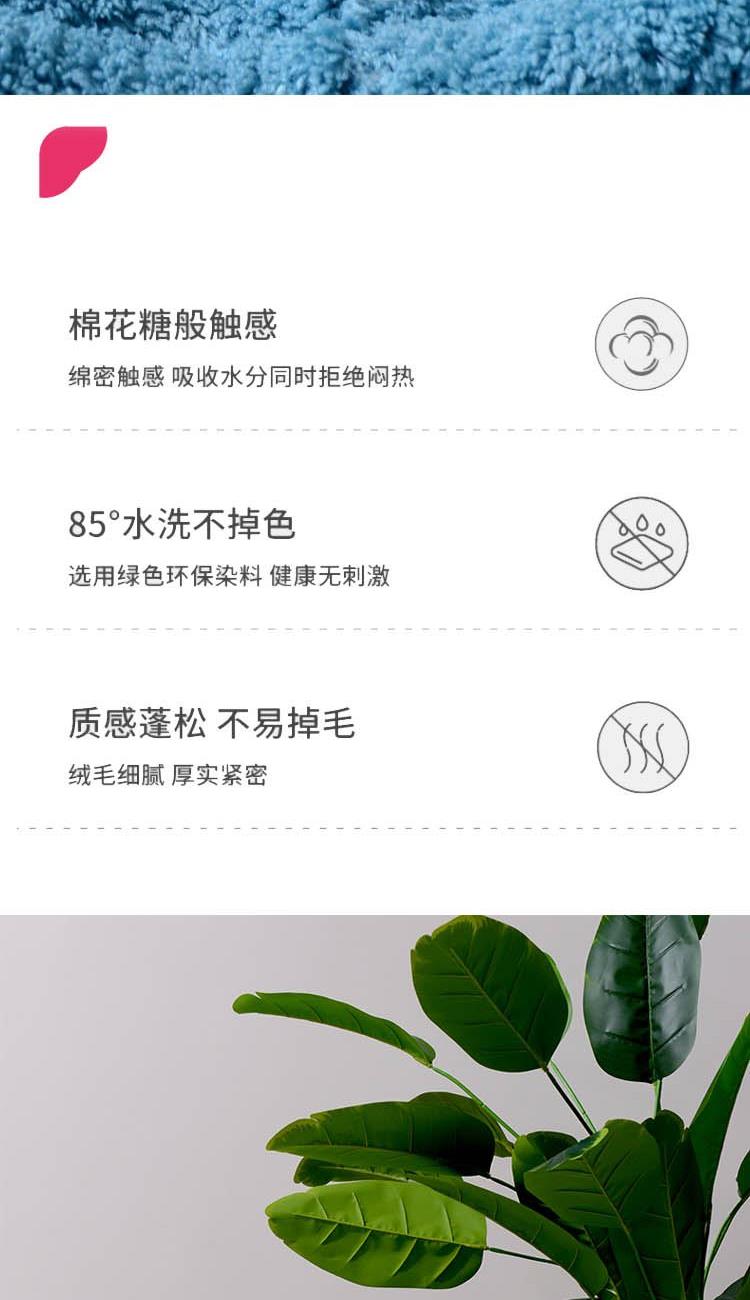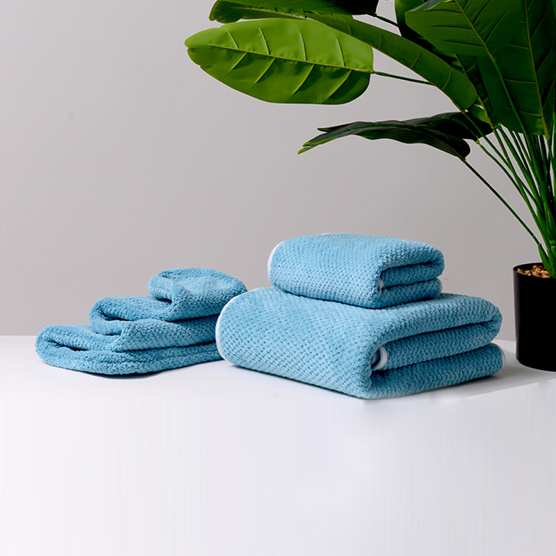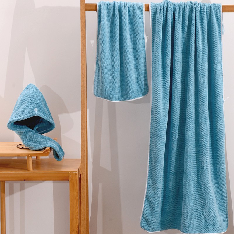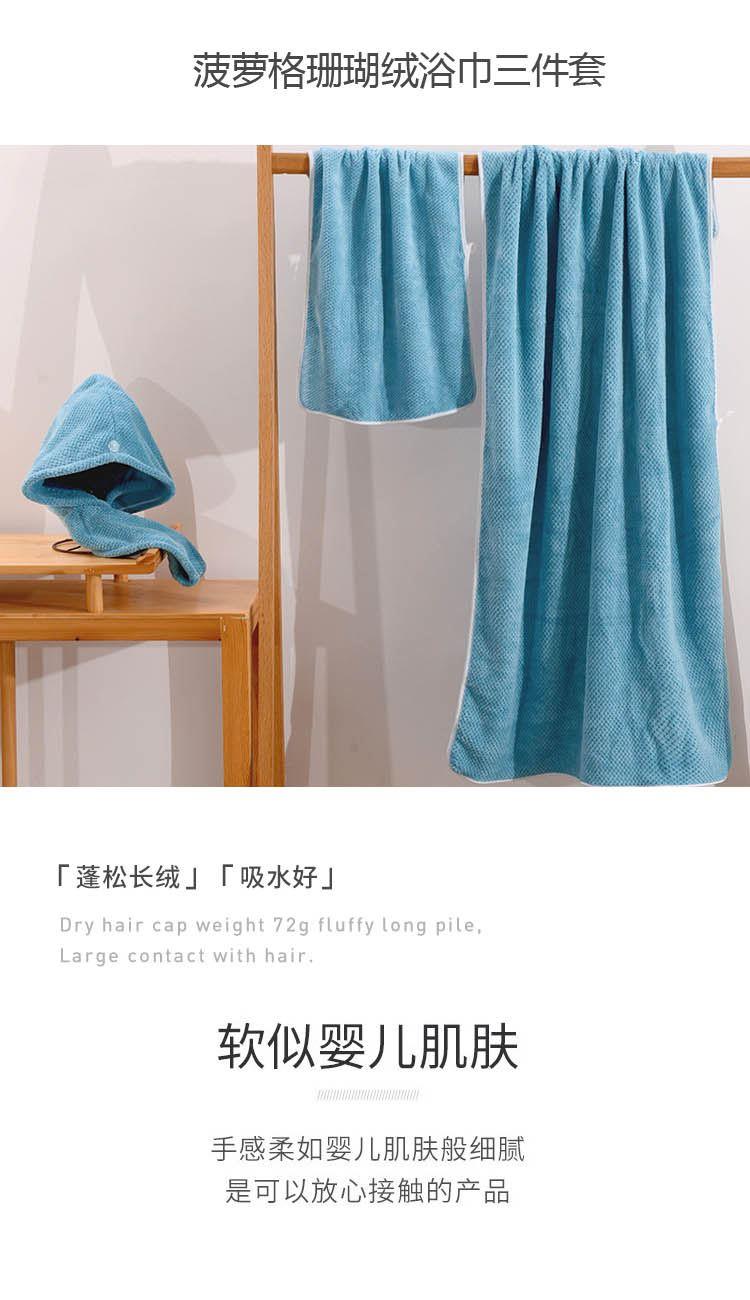 1、珊瑚绒采用超细纤维为原料制造生产,色彩斑斓、覆盖性好的呈珊瑚状的纺织面料。 2、质地细腻、手感柔软、不易掉毛、不起球、不掉色,对皮肤无任何刺激,不过敏。外形美观,颜色丰富。 规格:浴巾:1条/70*140cm 毛巾:1条/34*70cm 浴帽:1个/25*65cm 面料:聚酯纤维 颜色:蓝色 包装方式:礼盒+手提袋 包装尺寸: 370*290*60mm