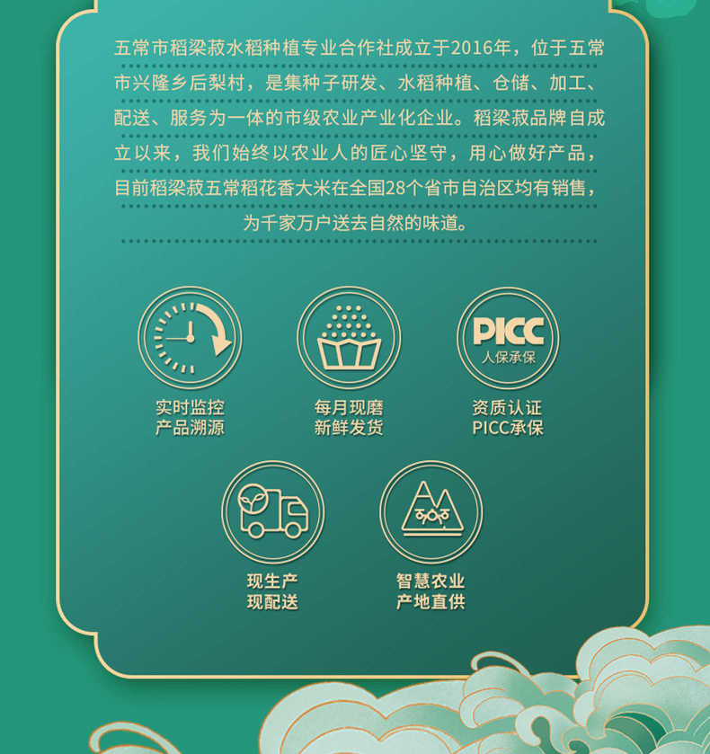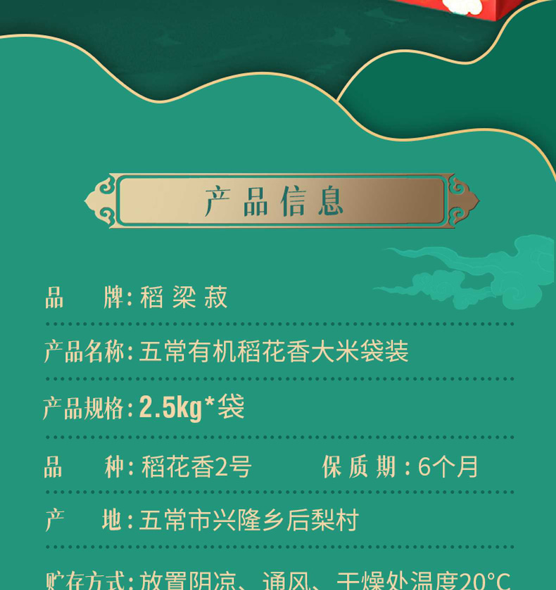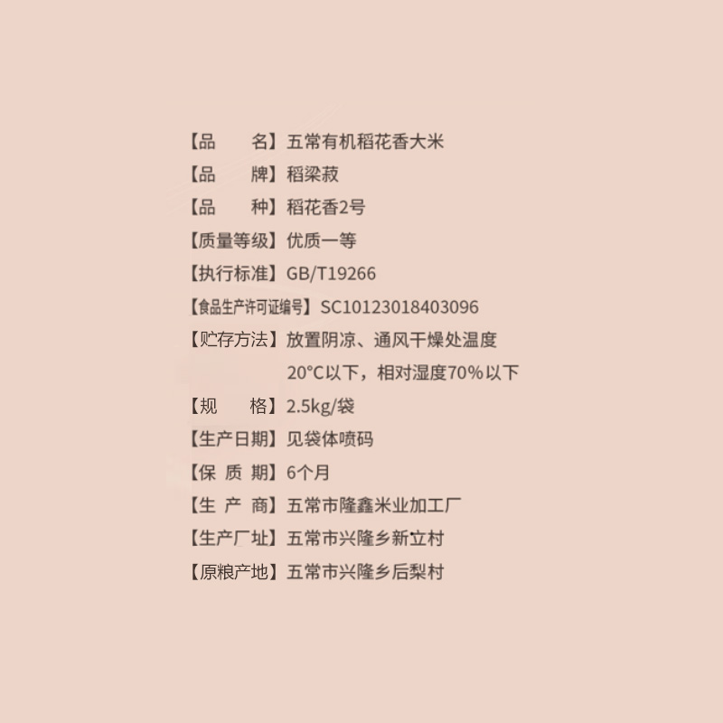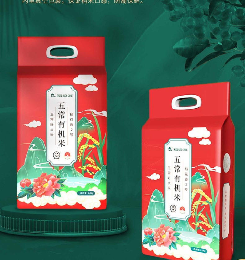 包装:真空袋装 执行标准:GB/T 19266 保质期:6个月 质量等级:优质一级 产地:黑龙江五常市 产品尺寸:250mm*210mm*60mm 推荐理由: 1、五常有机稻花香2号米。 2、PICC人保承保产品。 3、稻田24小时实时监控。 4、智慧农业系统。 5、当月现磨新米发货。 6、独立溯源码。 7、双层真空保鲜。