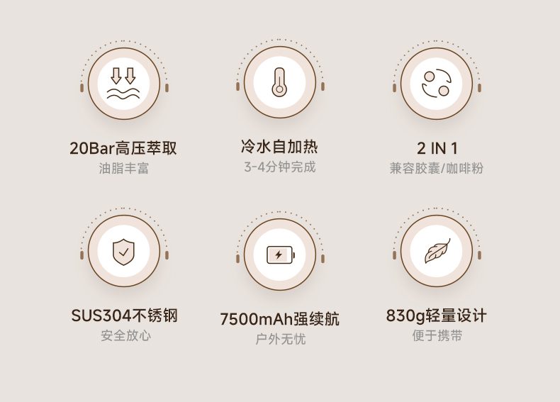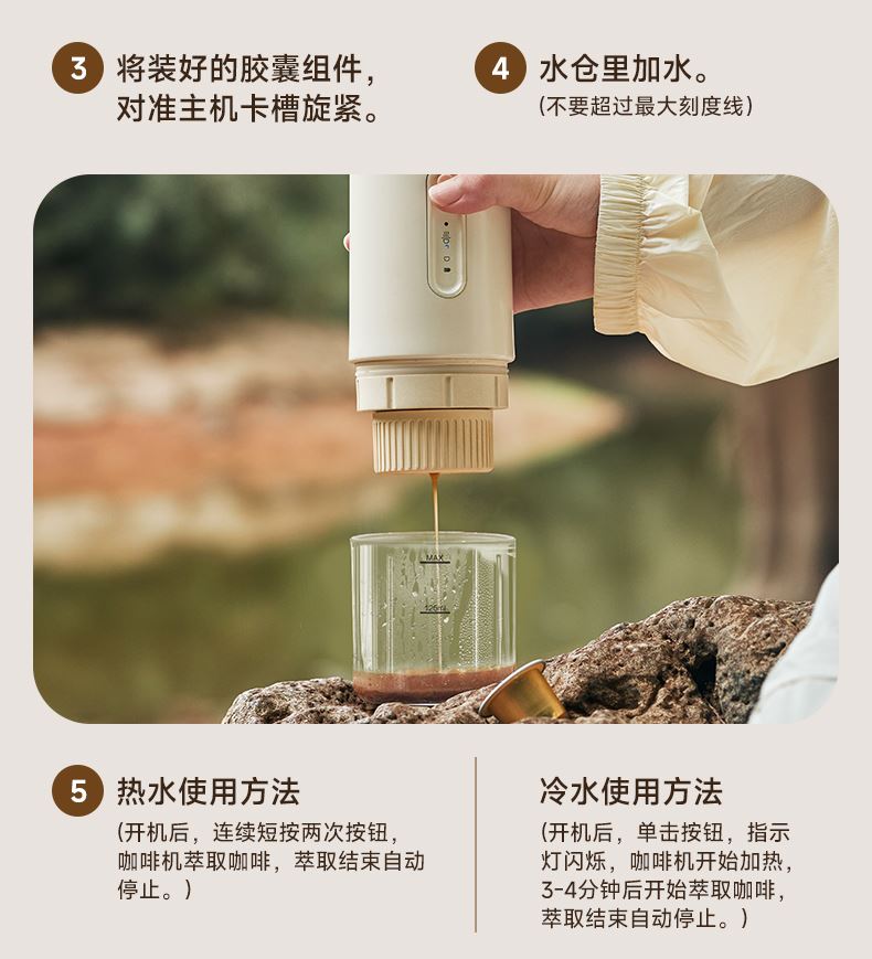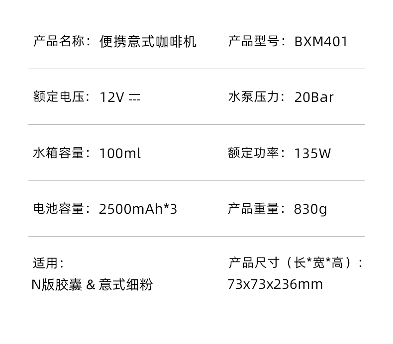 产品型号:BXM401 产品颜色:白色 额定电源:12V⎓;功率:135W 内置电池容量:3节2500mAh电池 水箱容量:100ML; 咖啡粉仓:7-14g咖啡粉,建议磨粉粗细:400-600um之间(细盐状) 胶囊仓:适配1个小咖啡胶囊-Nespresso Original系列 产品净重:0.83kg(是主机和3个配件的总重量;仅主机+粉仓/胶囊仓约0.79kg