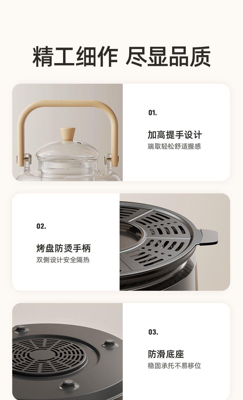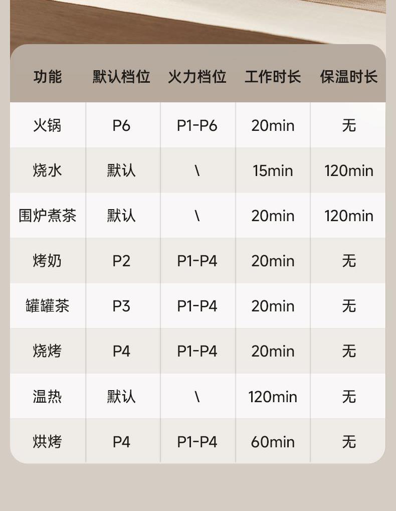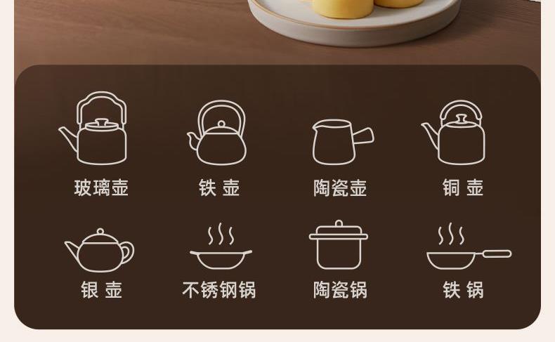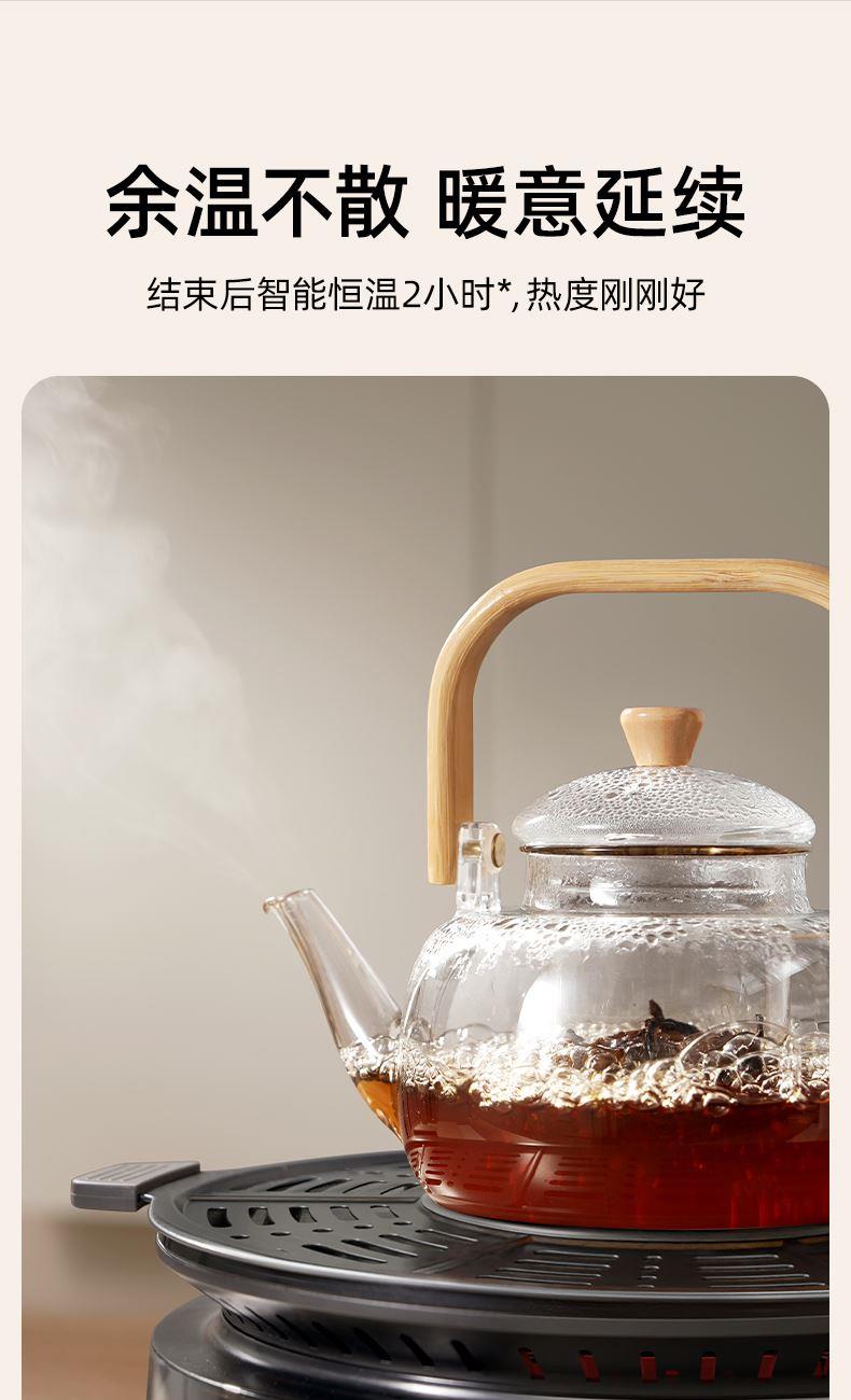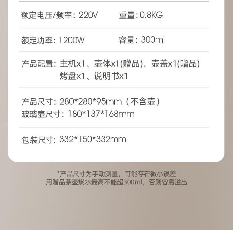主要材质:PBT外壳+微晶电陶发热盘 电压:220V 功率:1200W 容量:0.3L 1、无烟围炉,远红外发热 2、3D火山氛围灯 3、1200W聚能发热,快速烧水 4、适配耐高温其他容器,顺心搭配 5、耐高温微晶面板 6、程序结束自动转温热,时间2小时