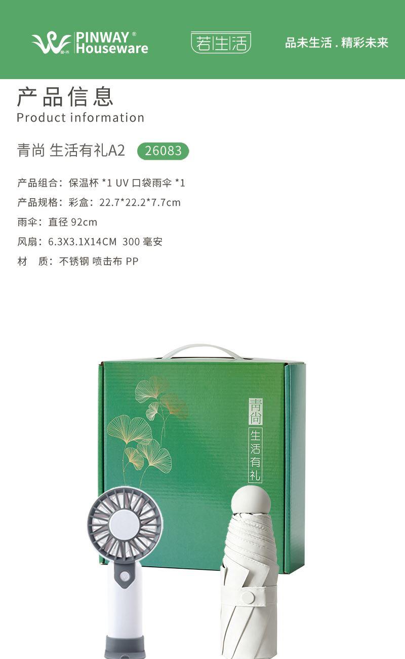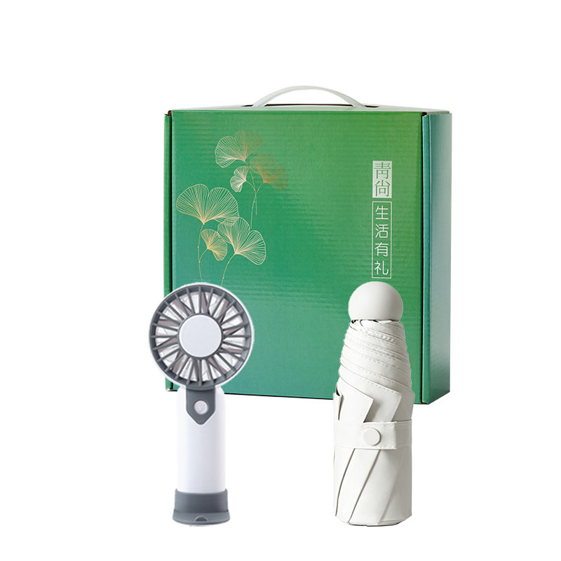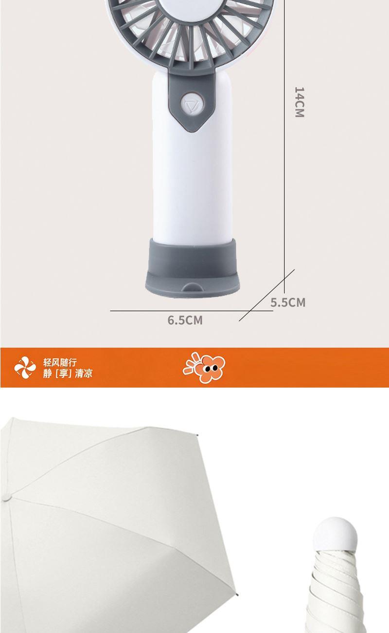 产品型号:26083 产品组合:风扇*1 UV口袋雨伞*1 产品规格: 雨伞:直径92cm 风扇:6.3X3.1X14CM 300毫安 材 质:不锈钢 喷击布 PP 包 装:彩盒 重量/套:44g