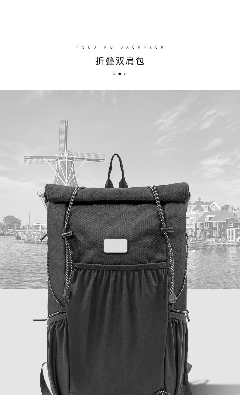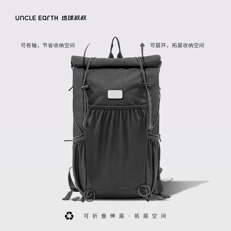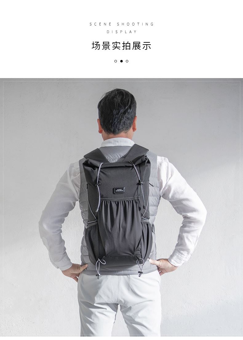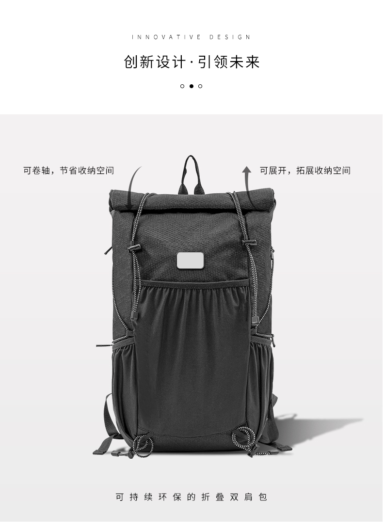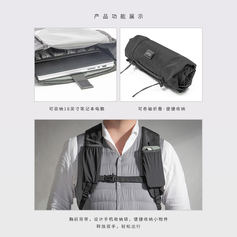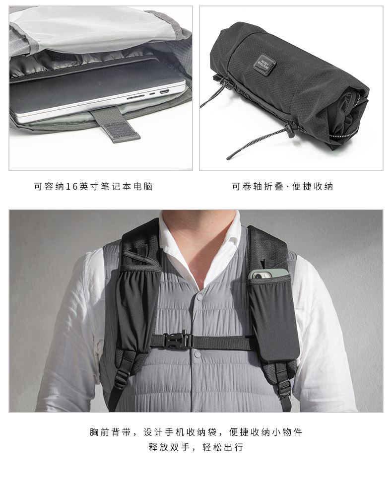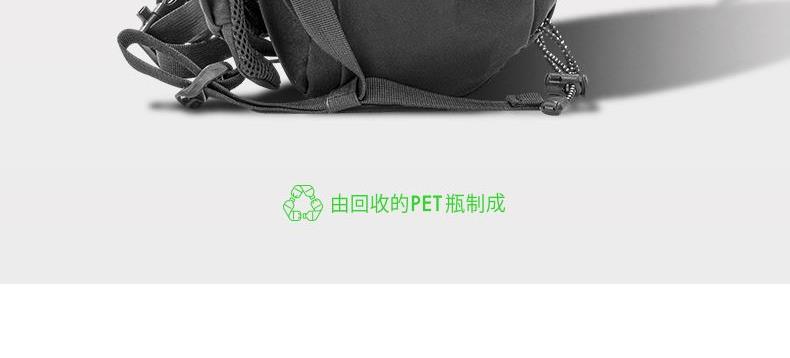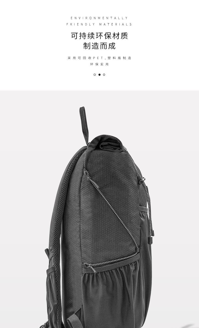 · 由回收塑料瓶RPET制成,相当于回收利用了20个500ml的PET塑料瓶· 户外紧急口哨,夜间反光条,确保道路物品安全· 全卷式闭合储存空间更大化,便于收纳· 防水防污面料,无畏雨天,透气肩带,可 存放手机· 软垫可容纳16寸笔记本电脑隔间· 外带侧边以及中间弹力口袋,可存放瑜伽垫,水瓶以及雨伞· 获得香港2024年设计奖