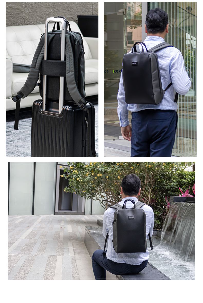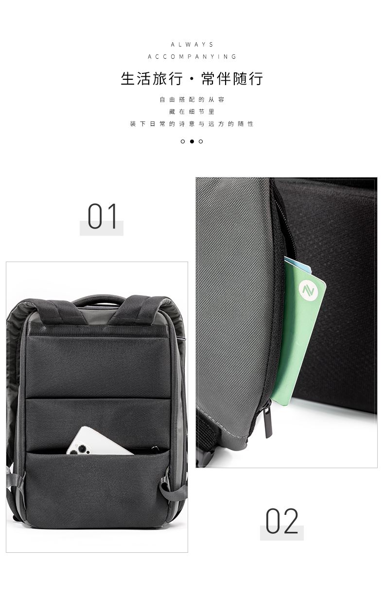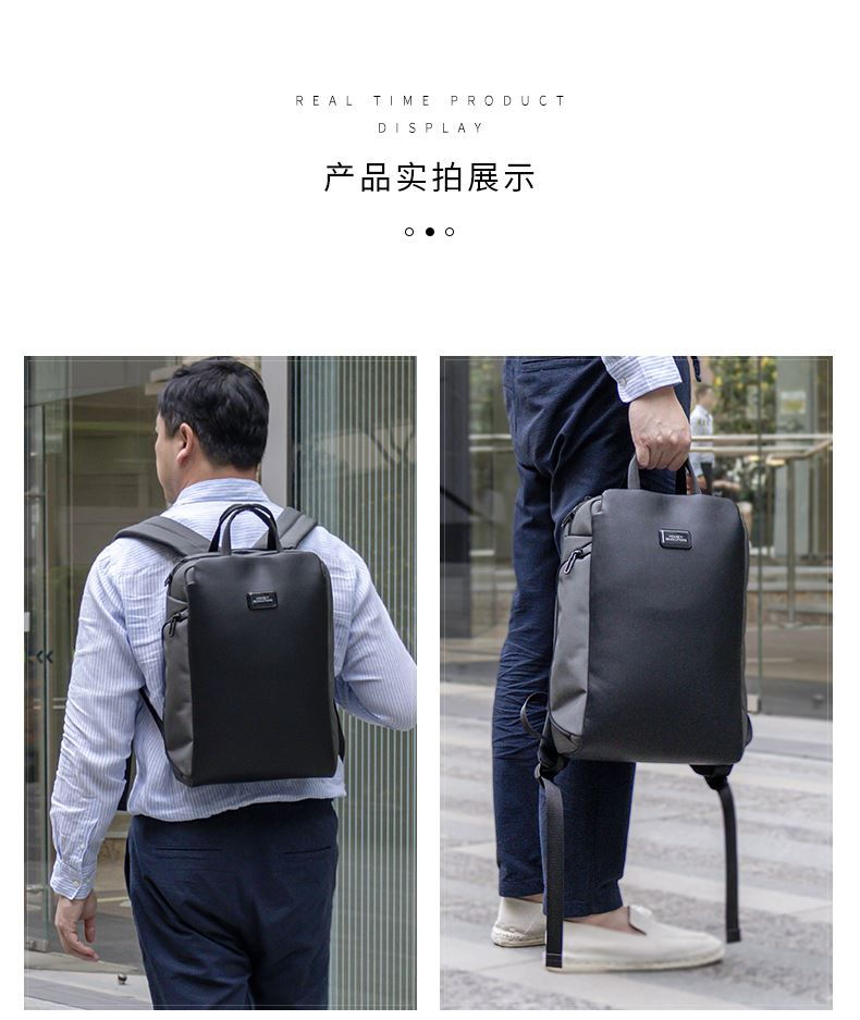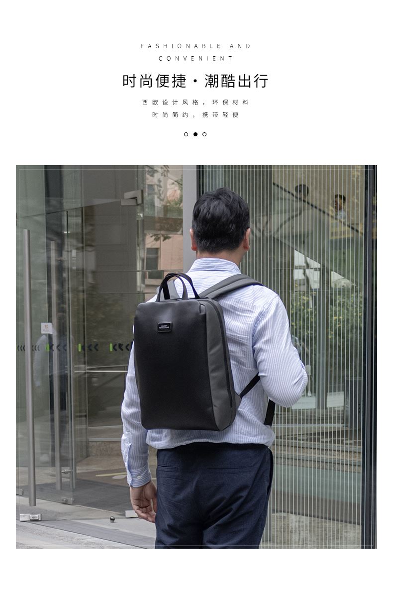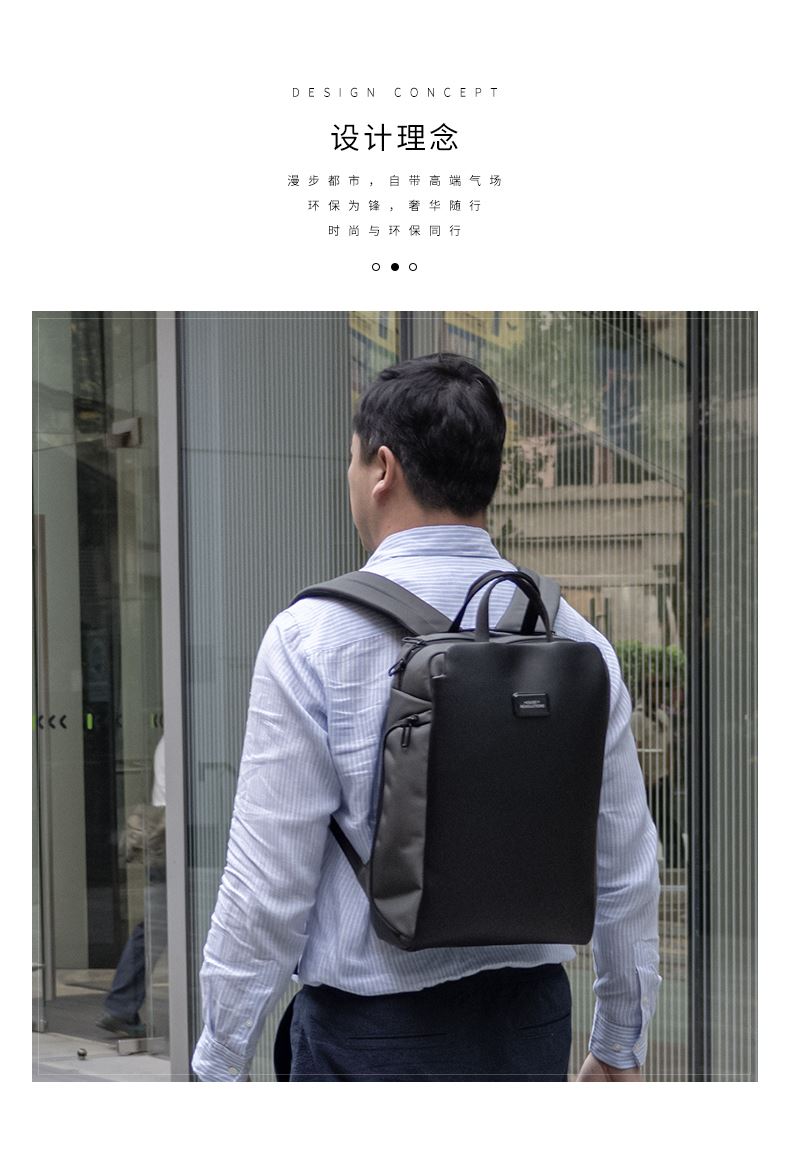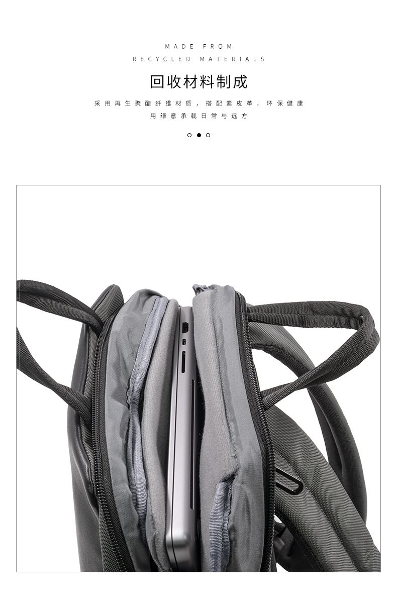 · 由7个500ML的PET制成,防水防污材料,搭配纯素皮革装饰· 兼具办公和休闲,配备行李箱背带,方便固定在行李箱上· 可携带16寸电脑,专用配件隔层,适合存储数据线等小物件 · 配备软衬眼镜隔层,不怕眼镜刮花磨损,保护您的眼镜的安全· 隐藏式防盗背板,用于储存钥匙,钱包等重要财物· 背带上配备口袋,便于身份证手机等证件的快速取用· 拥有RCS国际回收标准认证