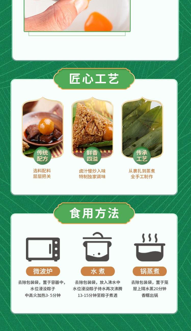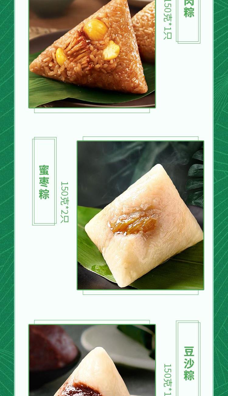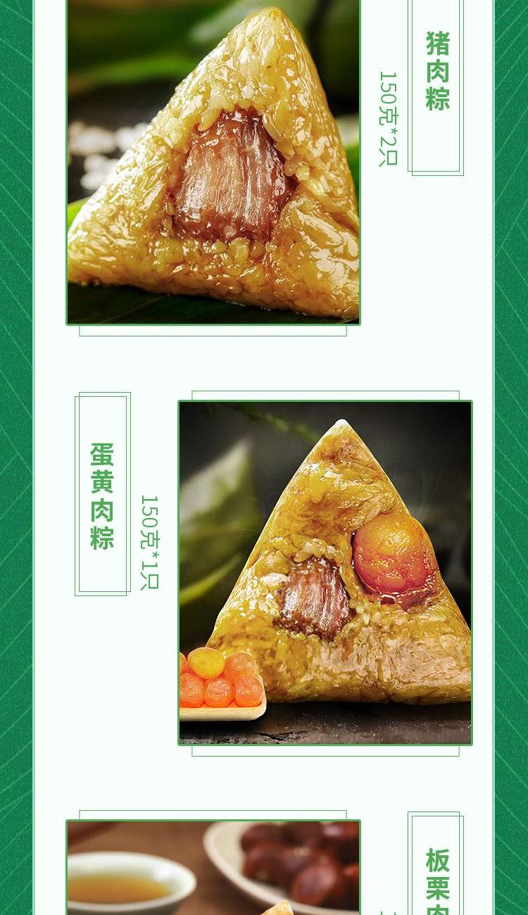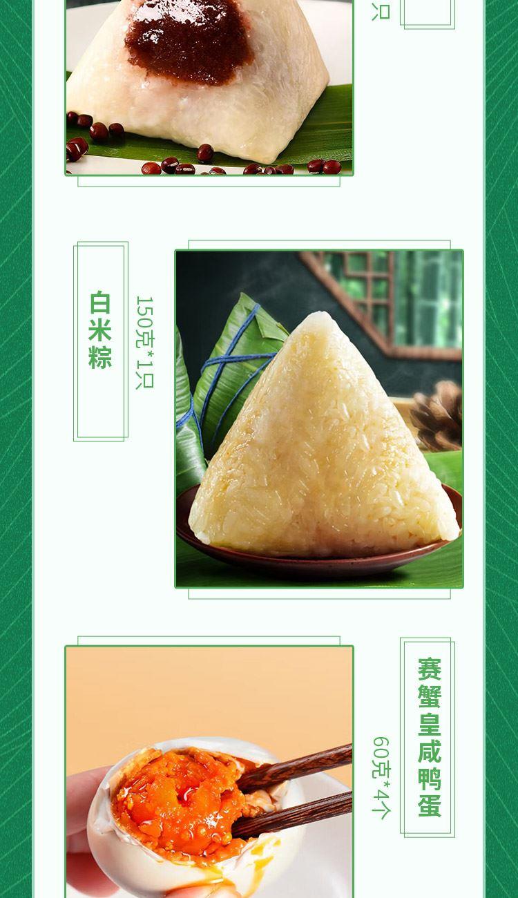 猪肉粽150g*2 蛋黄肉粽150g*1 板栗肉粽150g*1 蜜枣粽150g*2 豆沙粽150g*1 白米粽150g*1 赛蟹黄咸鸭蛋60g*4