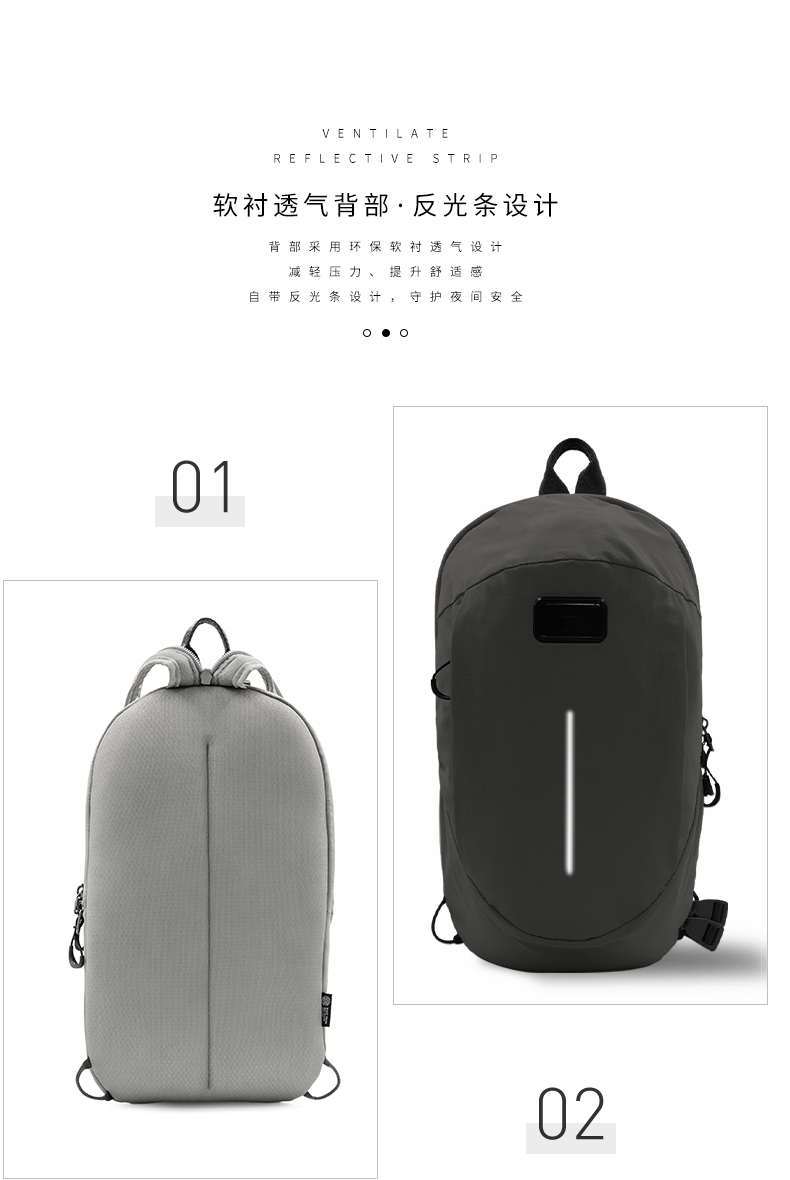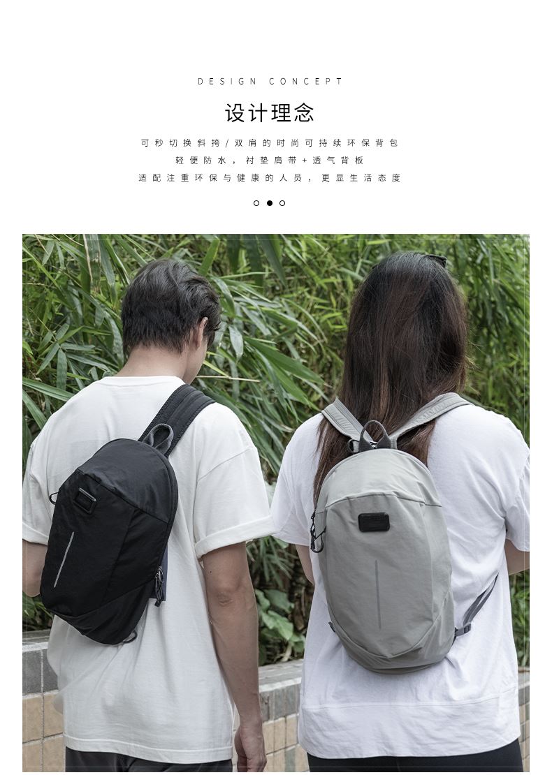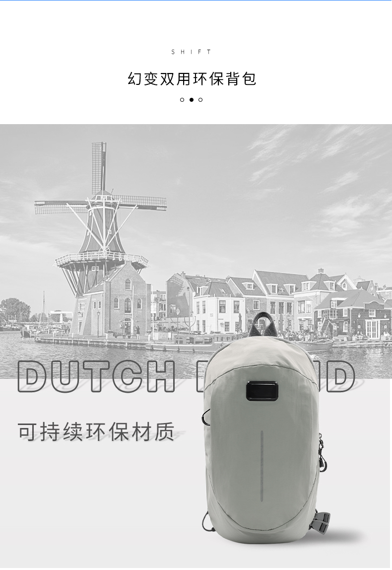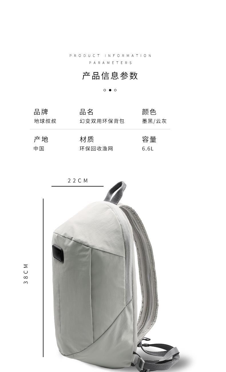 · 由回收渔网制成,独特耐磨纹理面料· 防水防污功能,无惧雨雪天气· 拉链一拉斜挎包变双肩包—几秒内切换风格。创新式设计可双向拉链· 配备衬垫肩垫和透气背板,舒缓减少长时间佩戴的压力· 6.6L大容量设计,容纳你的必需品· 反光条设计,保护夜晚人身安全· 拥有国际RCS回收环保认证。2种颜色可选:云灰色、哑黑色。