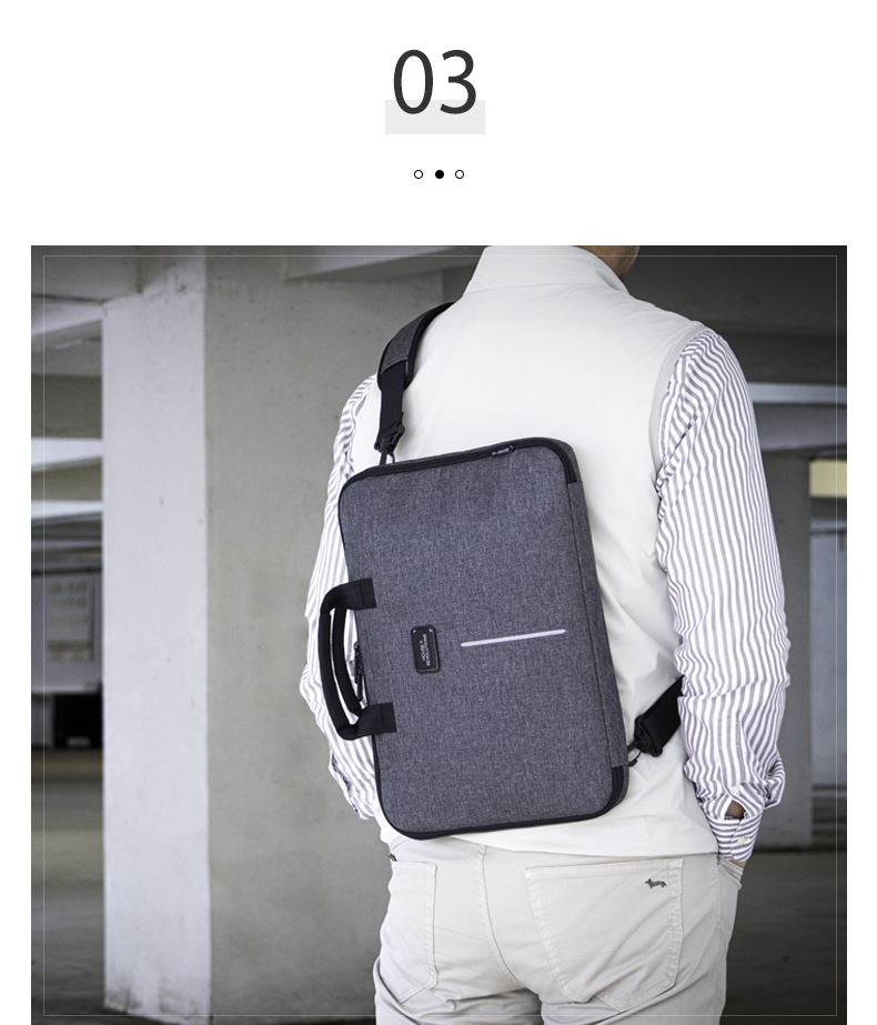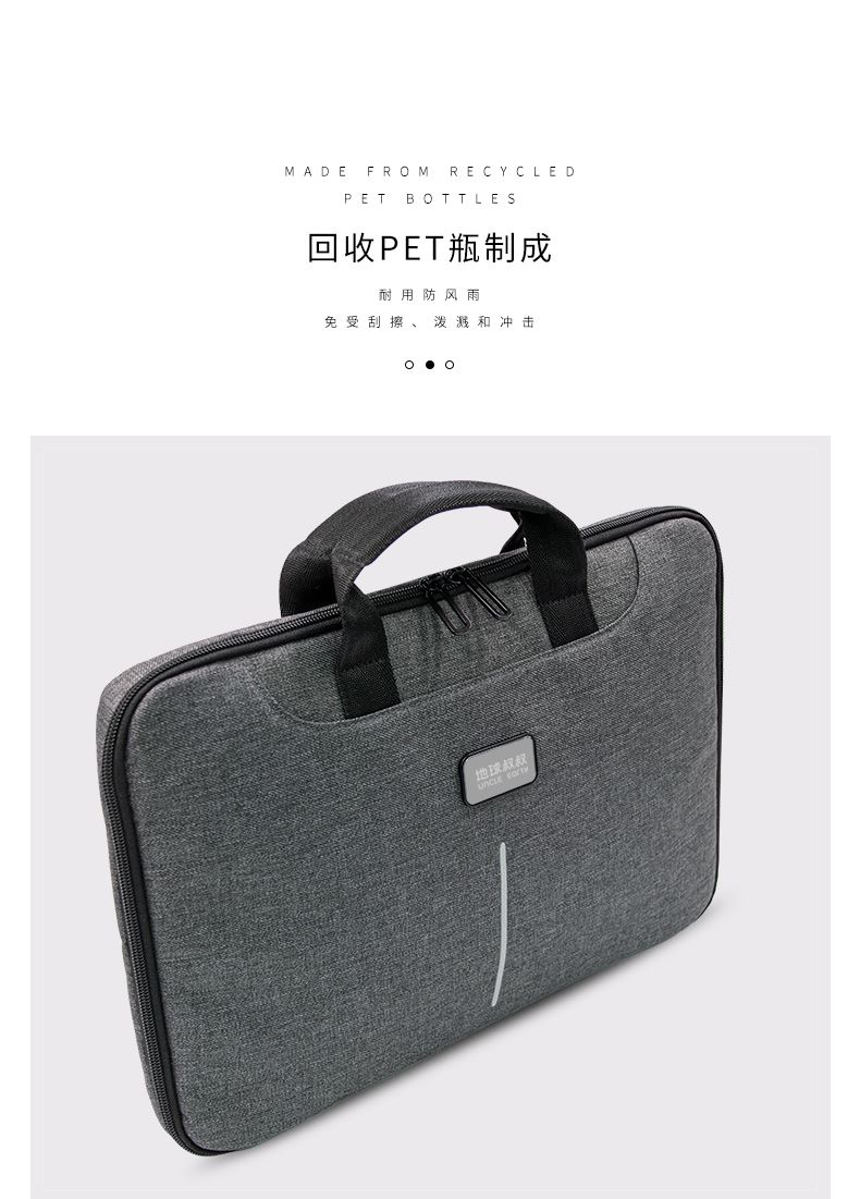 · 由回收塑料瓶RPET制成,相当于回收利用了6.5个500ml的PET塑料瓶· 三种携带功能电脑包。手提,肩背,斜挎包· 内衬具有防震垫,防泼水面料· 内袋配备多配件口袋,能180°打开电脑包· 可容纳15英寸笔记本电脑· 拥有RCS国际回收标准证明