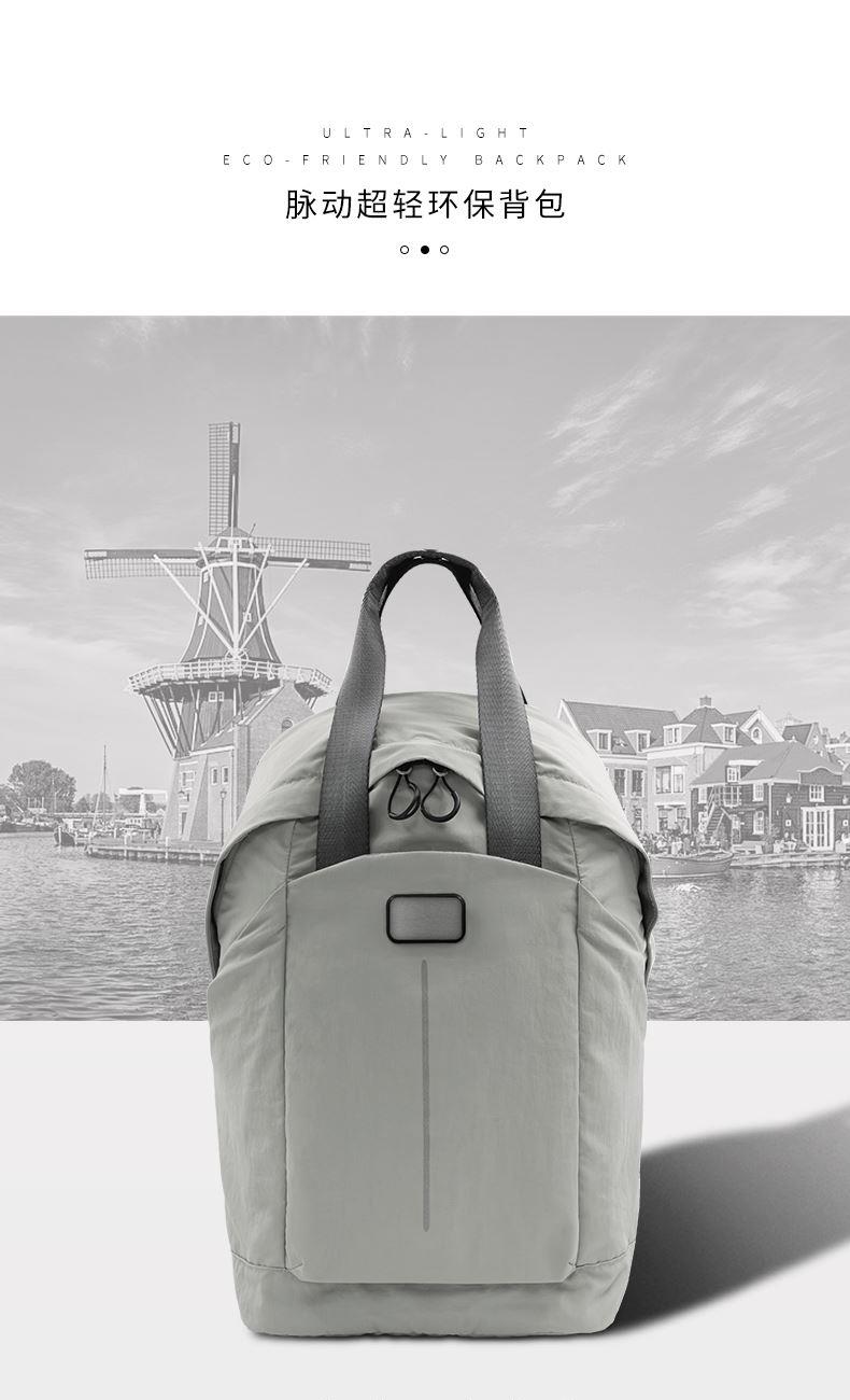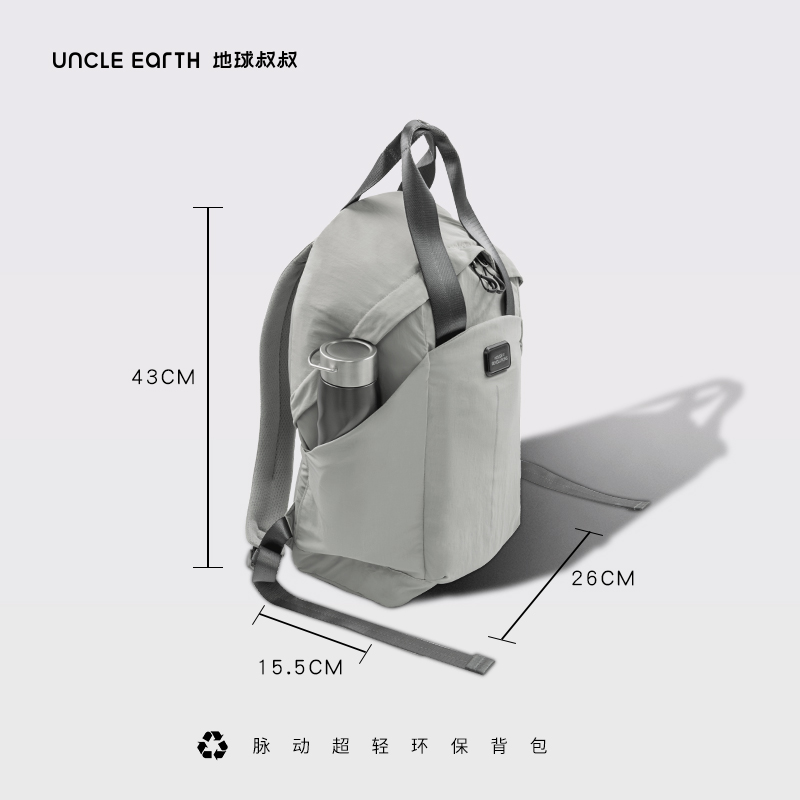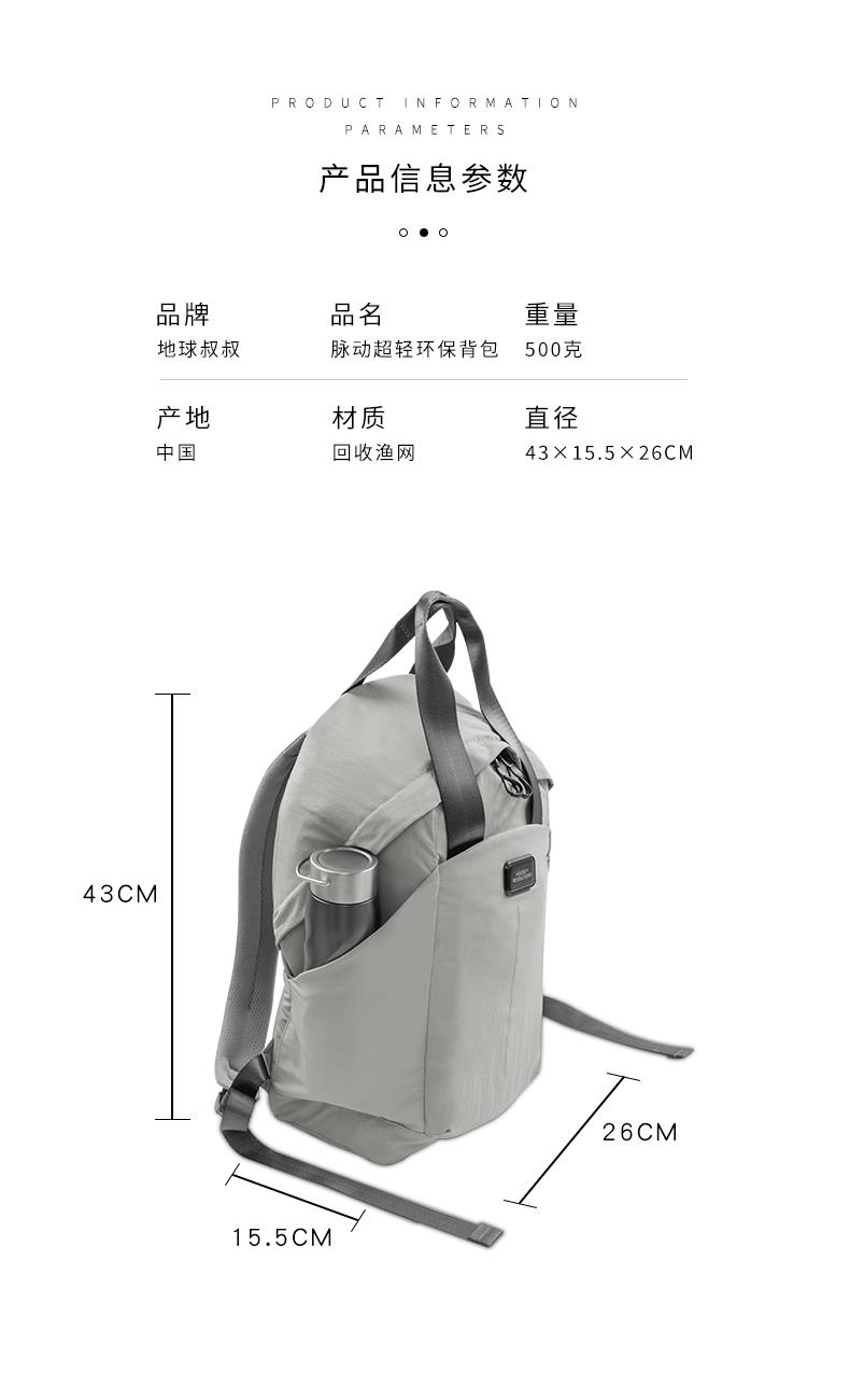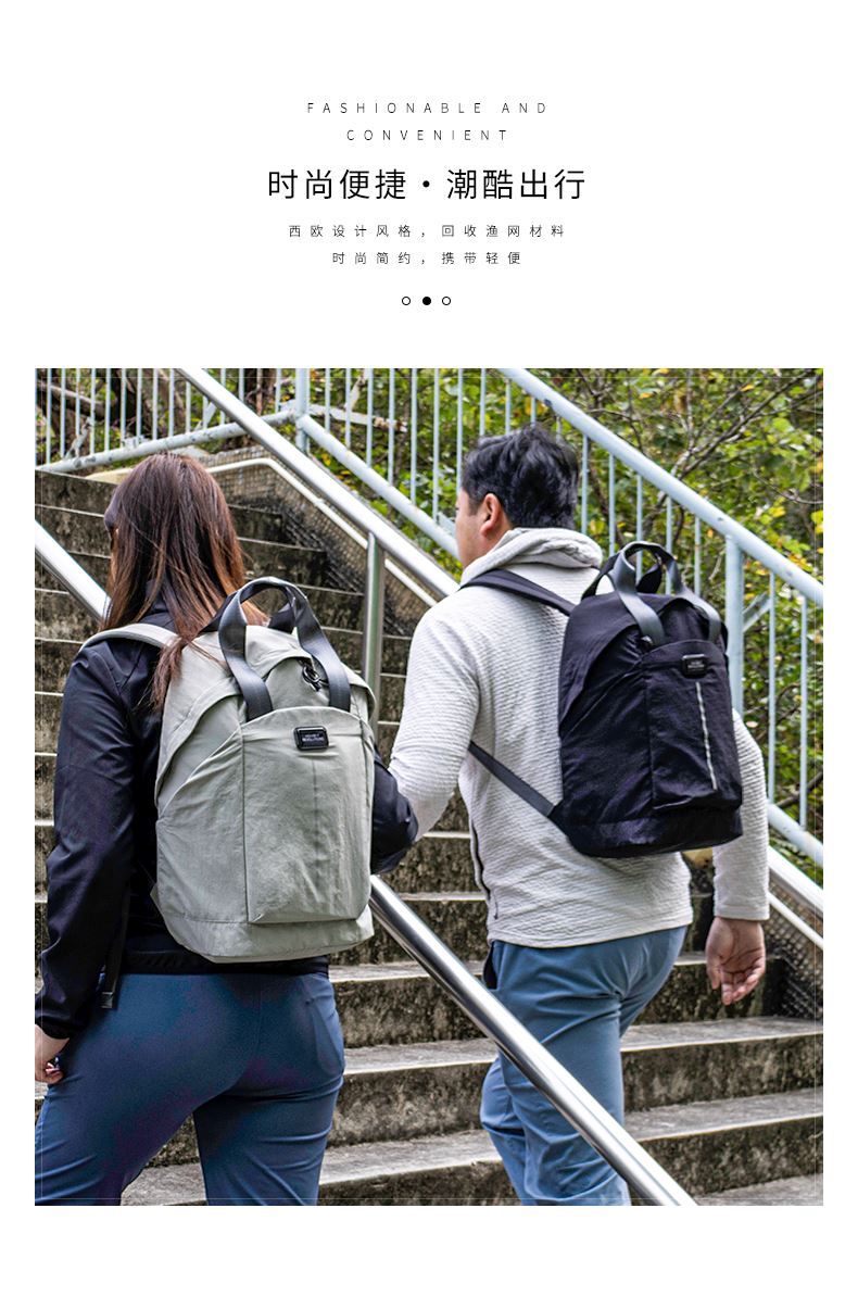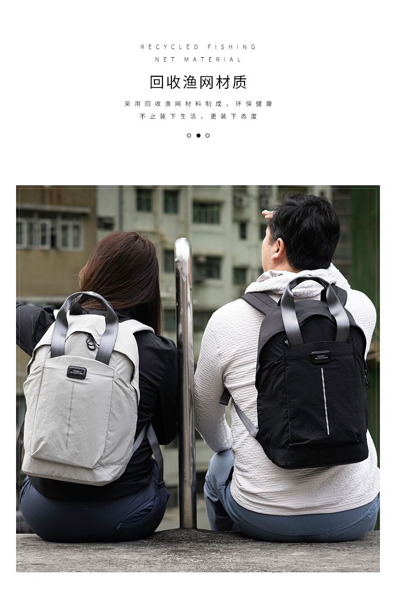 · 由回收渔网制成· 防水防污功能,超轻重量仅500克,超耐用回收尼龙· 17L容量,拉杆箱背带,超适合旅游健身或者日常使用· 带衬垫的笔记本电脑套,可容纳16英寸笔记本电脑隔层· 两侧超深侧口袋,可存放水瓶和雨伞· 软衬垫背部,人体工程学设计,能减少时间佩戴的压力· 反光细节,夜晚人身安全。2种颜色可选:云灰色、哑黑色。