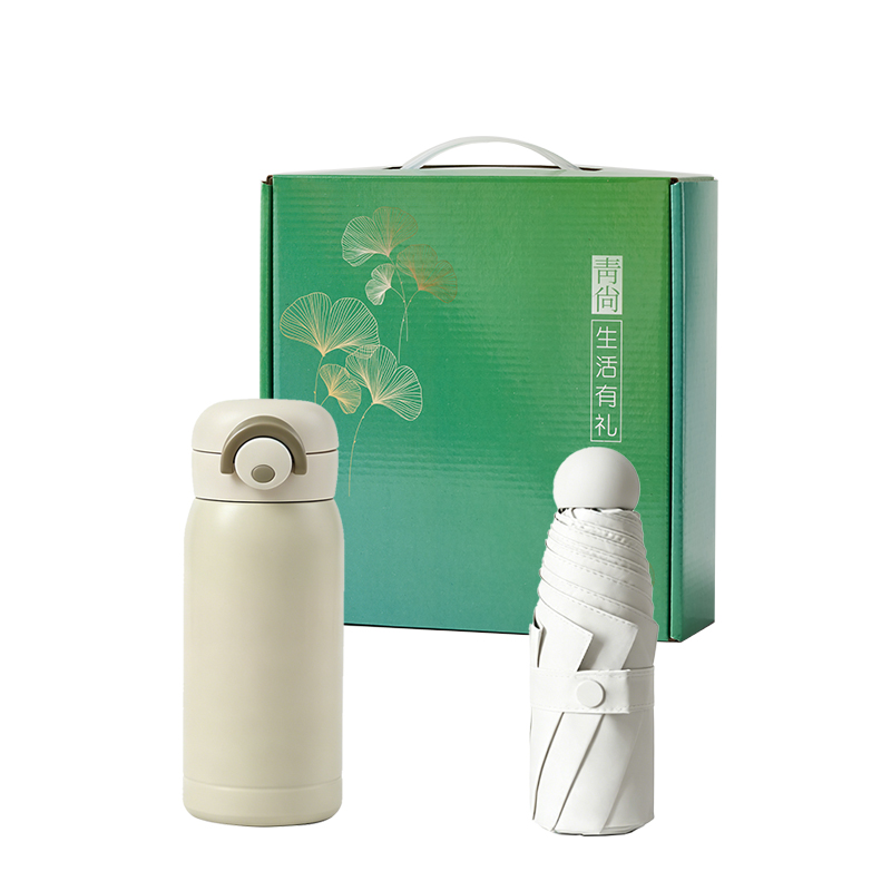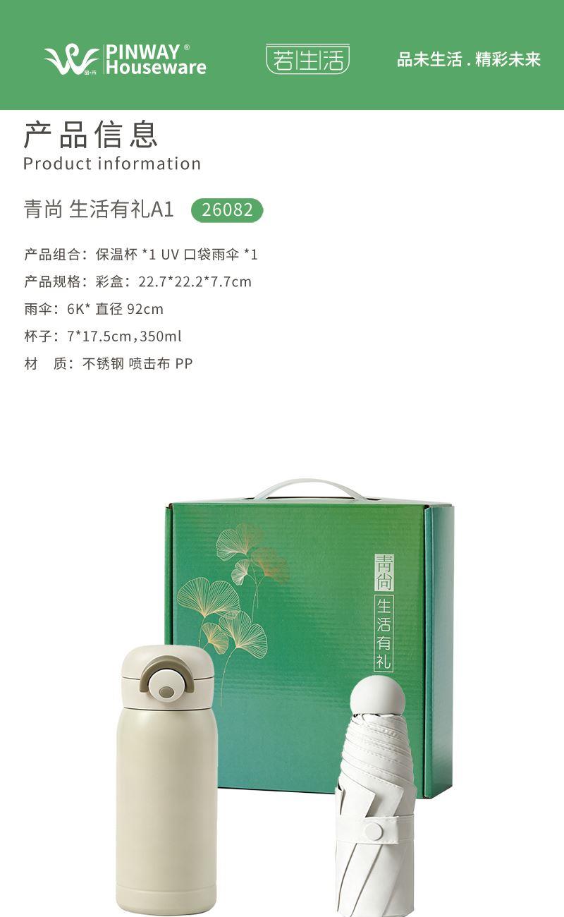 产品型号:26082 产品组合:保温杯*1 UV口袋雨伞*1 产品规格:彩盒:22.7*22.2*7.7cm 雨伞:6K*直径92cm 杯子:7*17.5cm,350ml 材 质:不锈钢 喷击布 PP 包 装:彩盒 重量/套:570g