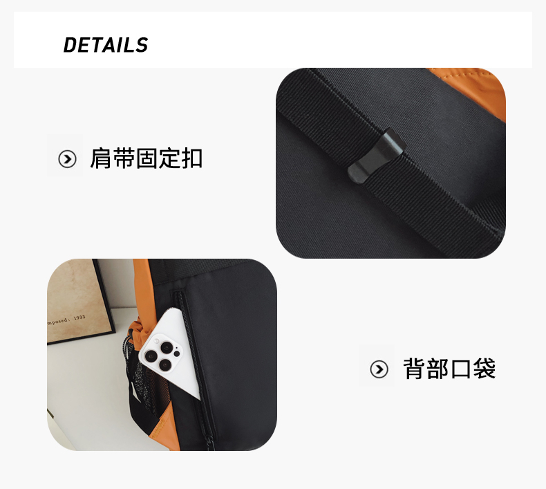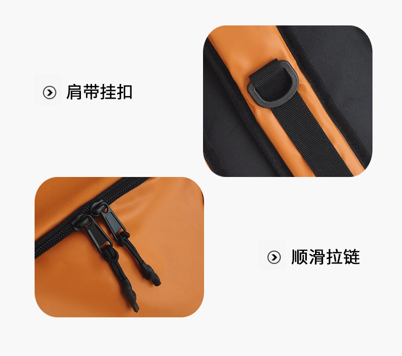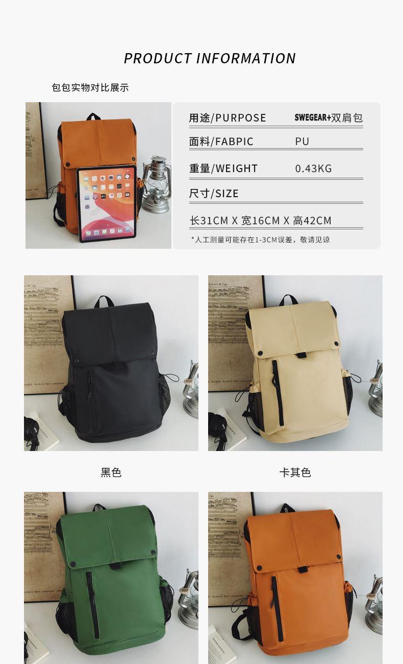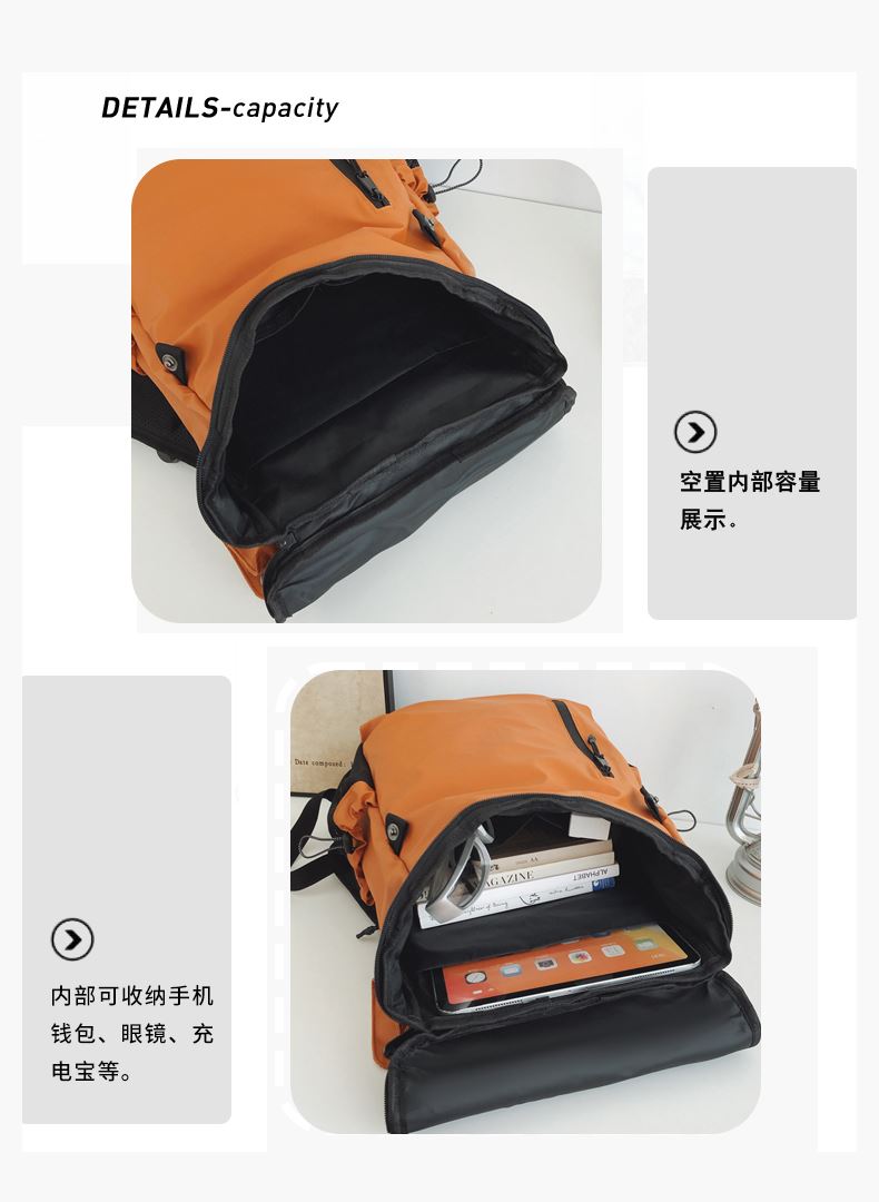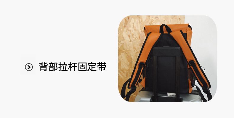 货号:612156 规格:42*31*16cm 颜色:黑色/橘色/卡其色/绿色 ★主面料:防泼水PU,里料:涤纶 ★主袋大容量隔层,可放下1-2天衣物 ★防滑拉链设计、顶部挂钩等贴心设计 ★拉杆插带设计,方便当包放置在拉杆箱上 ★背部和肩带三明治网透气设计,背负轻松