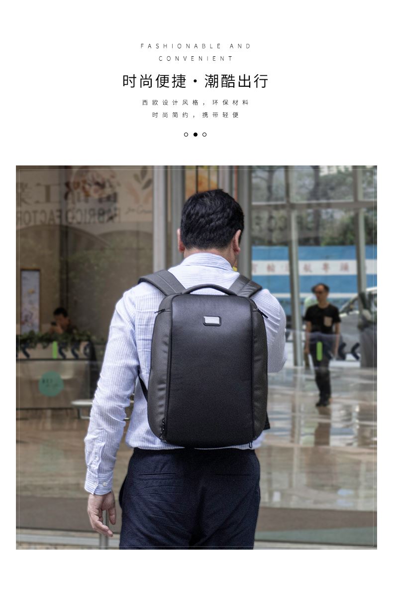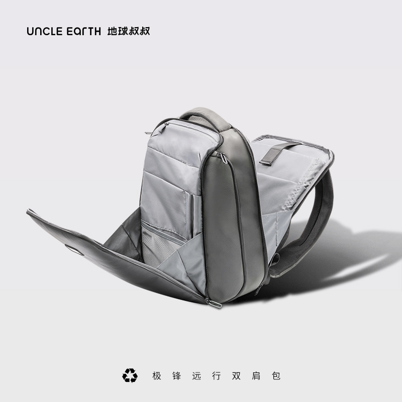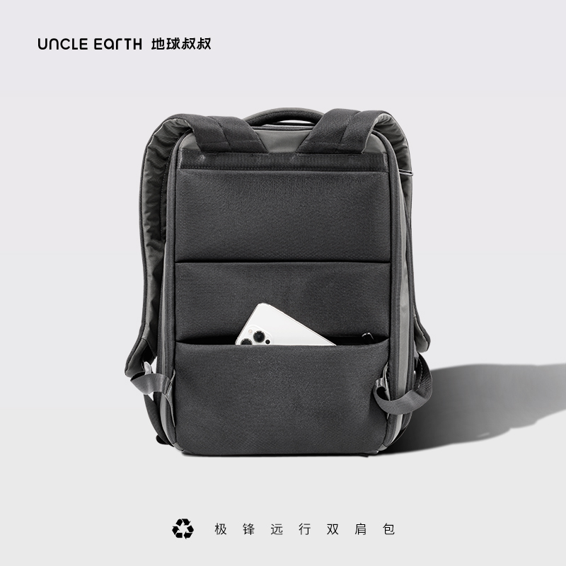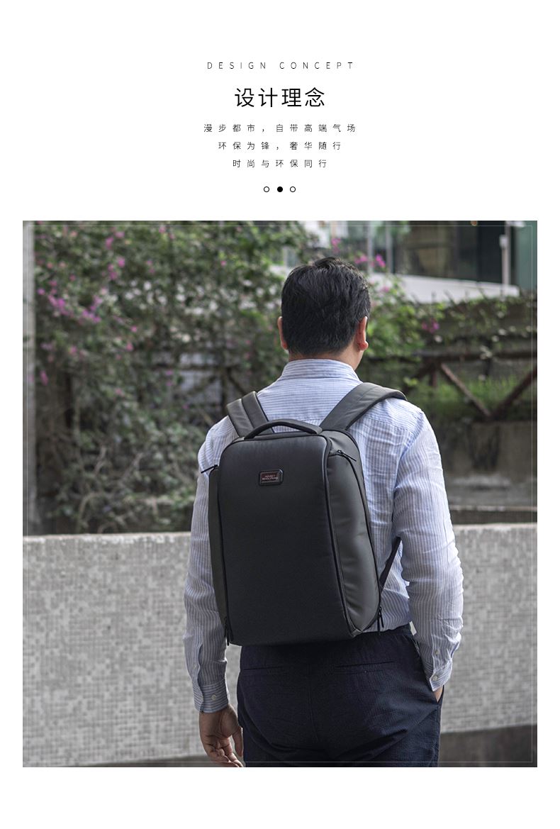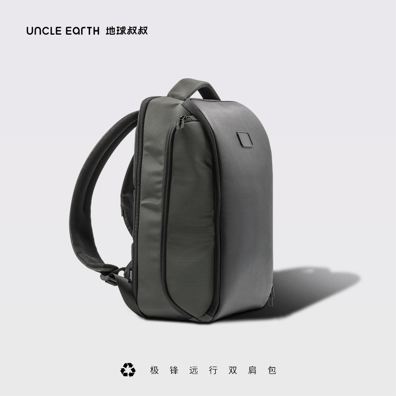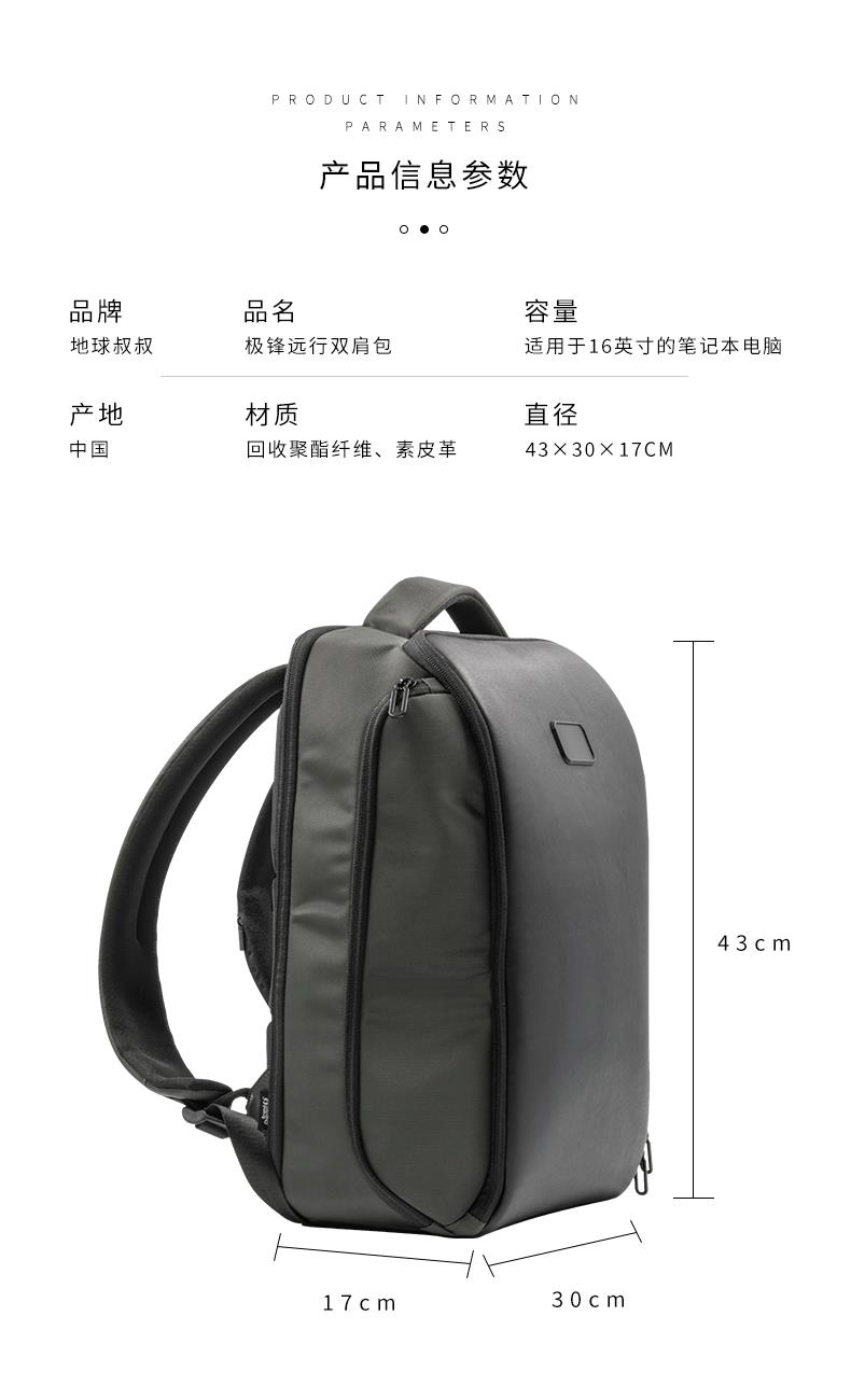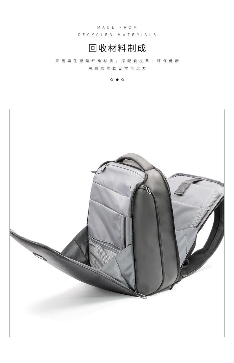 · 由回收素皮制成,搭配6个回收塑料瓶制成的装饰搭配· 防水防污材料,兼具办公和休闲,配备行李箱背带,方便固定在行李箱上· 可携带16寸电脑,背垫和前袋皆可打开,三明治结构前袋专用配件隔层,适合存储数据线等小物件 · 主仓配备软衬眼镜隔层,不怕眼镜刮花磨损,保护您的眼镜的安全· 隐藏式防盗背板,用于储存钥匙,钱包等重要财物· 背带上配备口袋,便于身份证,手机等证件的快速取用· 拥有RCS国际回收标准认证