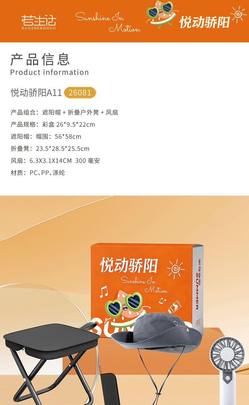 产品型号:26081 产品组合:遮阳帽+折叠户外凳+风扇 产品规格:彩盒26*9.5*22cm 遮阳帽:帽围:56*58cm 折叠凳:23.5*28.5*25.5cm 风扇:6.3X3.1X14CM 300毫安 材质:PC、PP、涤纶 包装:彩盒 重量/套:620g